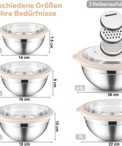 HaWare Rührschüssel 5er Set, Edelstahl Schüssel Salatschüssel Set mit Transparenten Luftdichten Deckeln & 3 Reibenaufsätzen zum Kochen Backen, 4,5L/2,8L/1,5L/1,2L/0,7L, Spülmaschinenfes, Khaki