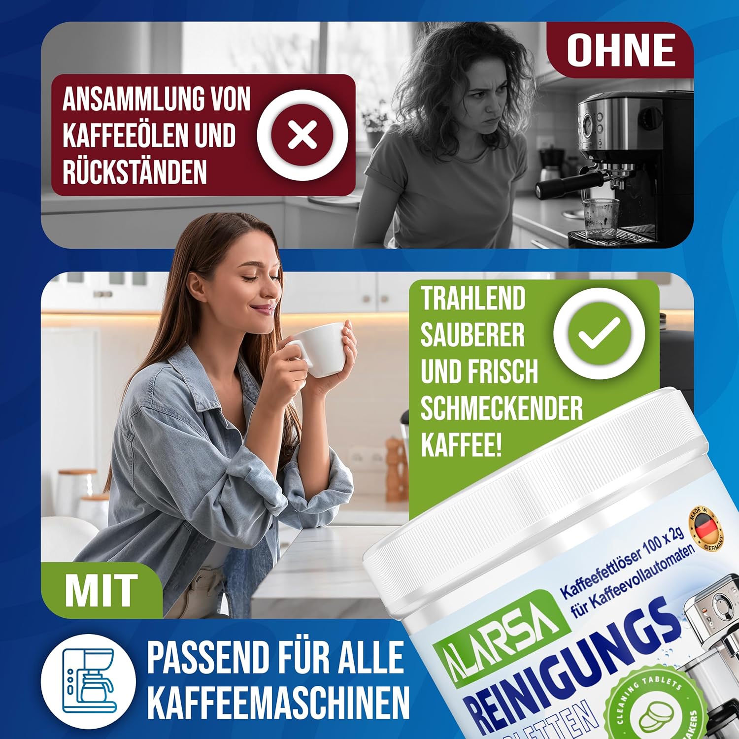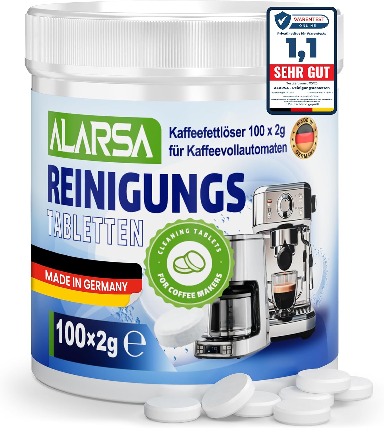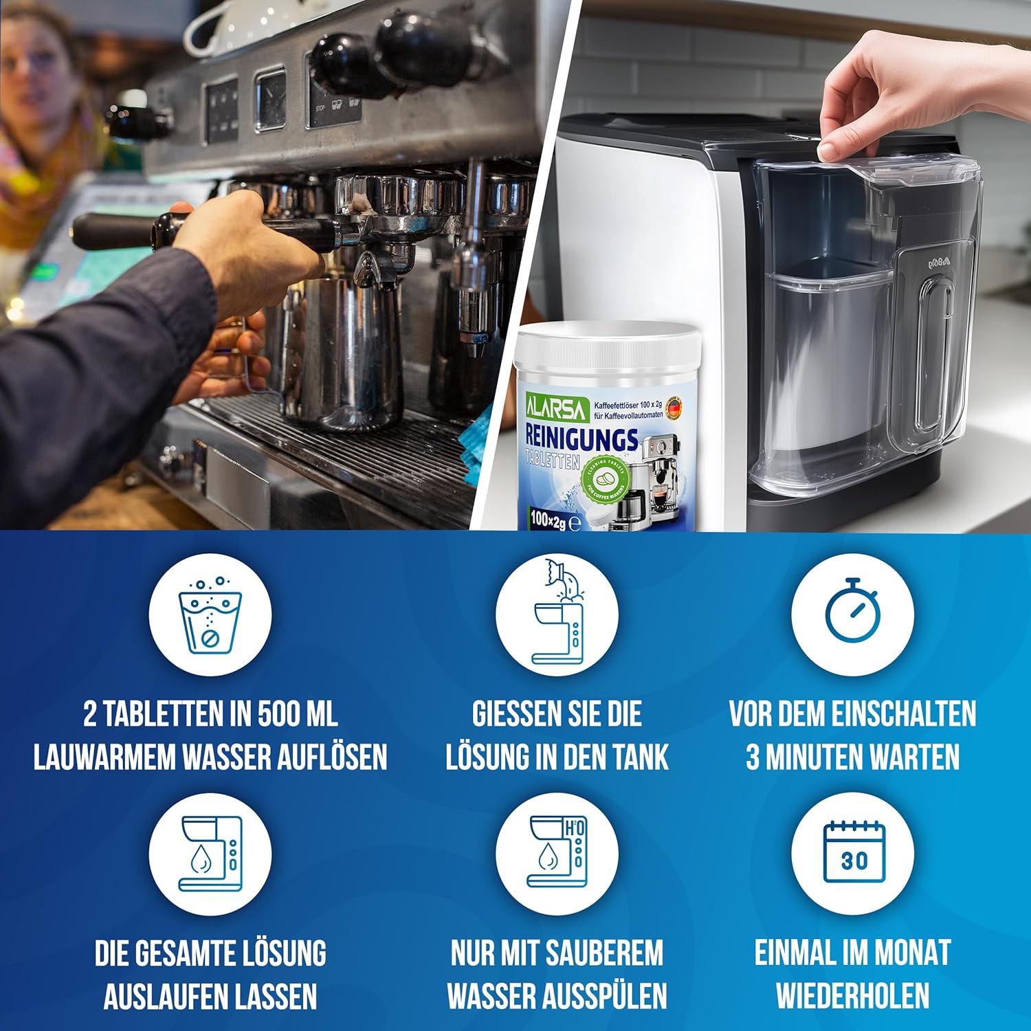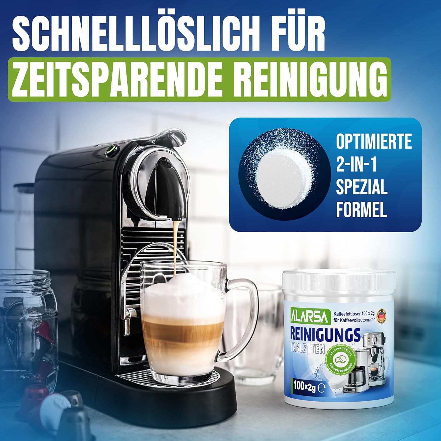 - ✅ 𝗥𝗘𝗜𝗡𝗘𝗥 𝗞𝗔𝗙𝗙𝗘𝗘𝗚𝗘𝗡𝗨𝗦𝗦 𝗢𝗛𝗡𝗘 𝗥Ü𝗖𝗞𝗦𝗧Ä𝗡𝗗𝗘: Die hochwertigen kaffeefettloser reinigungstabs von ALARSA, entfernen zuverlässig Kaffeefett kaffeeöl und hartnäckige Rückstände aus Ihrem kaffeeautomat Diese praktischen tabs wirken als effektiver kaffeeöl entferner und sorgen dafür dass das volle kaffee Aroma erhalten bleibt. Ideal für jeden vollautomat genießen Sie jede Tasse in bester Qualität.