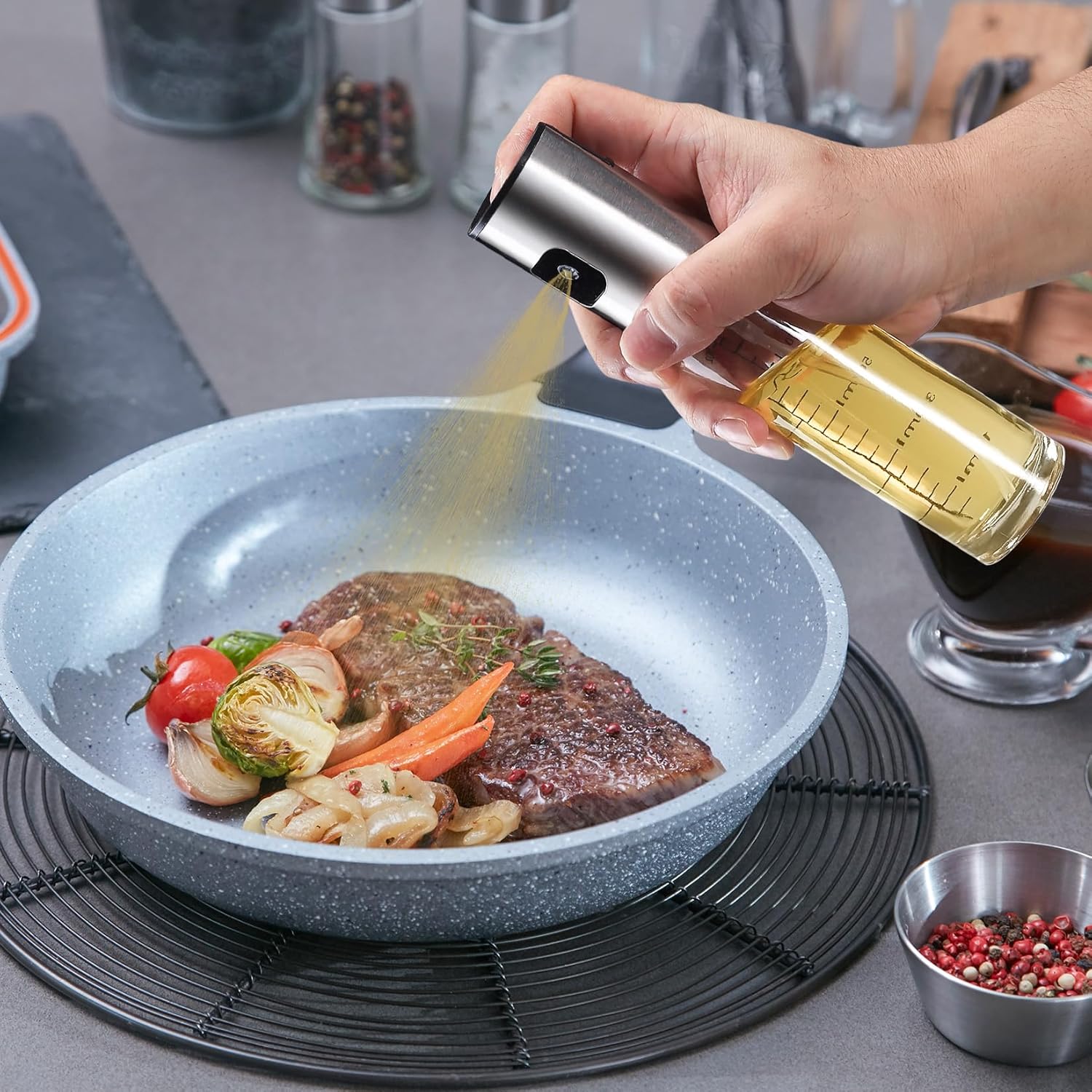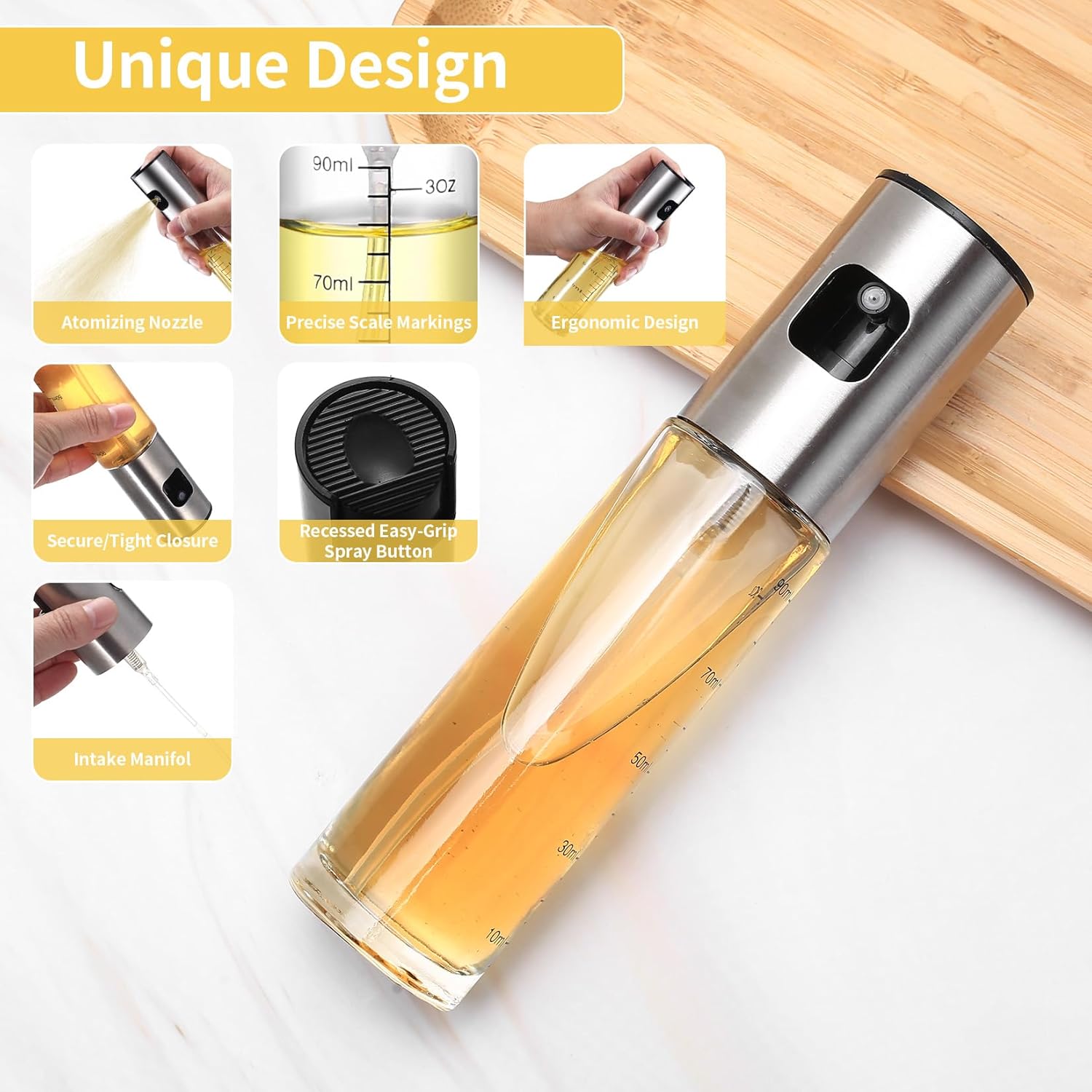- Feiner Nebel: ölspray zum kochen kann feinen Nebel erzeugen, der fein und gleichmäßig ist und uns hilft, die verwendete Ölmenge zu reduzieren; öl sprayflasche hat ein Fassungsvermögen von 100 ml und klare Skalen zur einfachen Beobachtung der verbleibenden Menge
