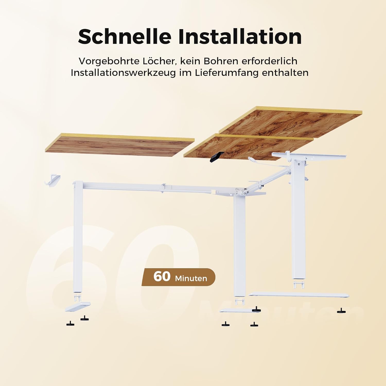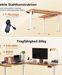 Die Lieferung war schnell, der Schreibtisch sehr gut und sicher verpackt; die Teile wirken hochwertig und sind klar beschriftet, Schrauben und Werkzeug liegen bei, wodurch der Aufbau auch für Laien in etwa einer Stunde problemlos gelingt. Die 15 mm Platten und das Gestell stehen stabil ohne Wackeln, die elektrische Höhenverstellung (72–115 cm) läuft leicht und leise, zwei Memory-Positionen und digitale Zentimeteranzeige funktionieren gut; praktische Haken und eine Kabelschiene sorgen für Ordnung. Preis/Leistung stimmt (ich habe 136 € bezahlt), die L‑Form bietet viel Platz und ich kann den Tisch mit Katzen und Kindern bestens empfehlen.