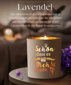 Schöne Lavendel-Duftkerze, die einen dezenten, beruhigenden Duft verströmt. Sehr schön verpackt, hochwertige Verarbeitung und ideal als Geschenk für Mama, Freundin oder Oma; brennt sauber und lange, ich bin sehr zufrieden.