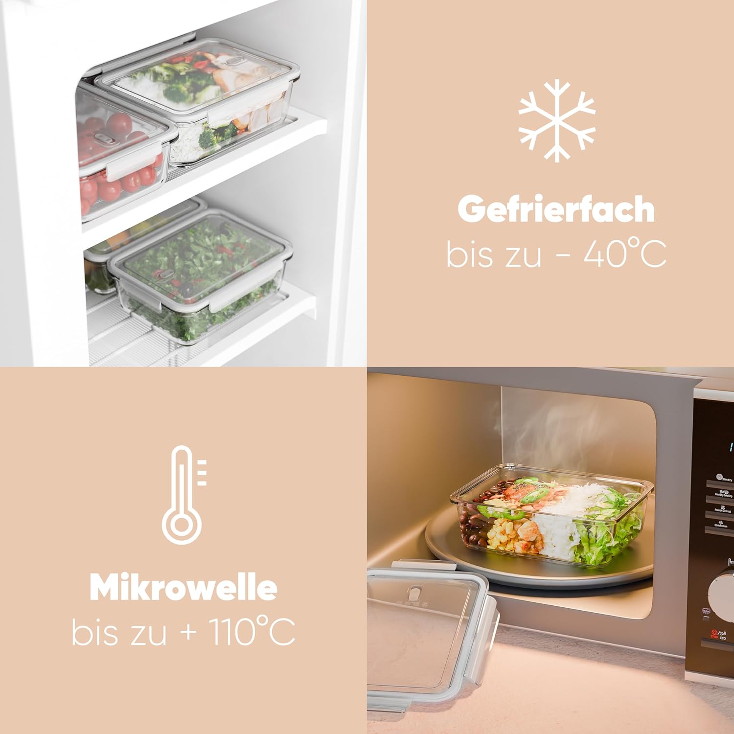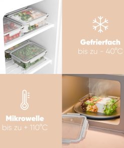 - Die classbach Dosen Meal Prep Glas sind geeignet für Geschirrspüler, Gefrierfach (bis zu -40°C), Ofen (Glasbehälter bis zu 400°C) und Mikrowelle (mit Deckel bis zu +110°C)
