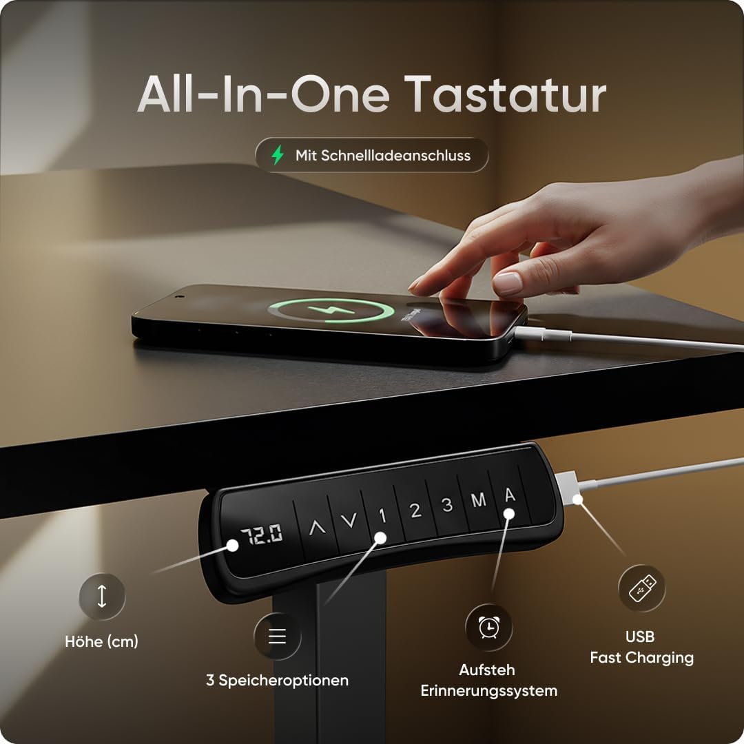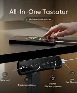 - FORTSCHRITTLICHE ALL-IN-TASTATUR – Durch die drei programmierbaren Voreinstellungen in unser Schreibtischgestell können Sie drei gewünschte Höhen abspeichern. Das Sitz-/Steh- Zeit-Erinnerungs-System hilft auch dabei, Sie bei Ihrer Arbeitszeit zu unterstützen. Zusätzlich bietet die Tastatur eine USB-Ladefunktion.