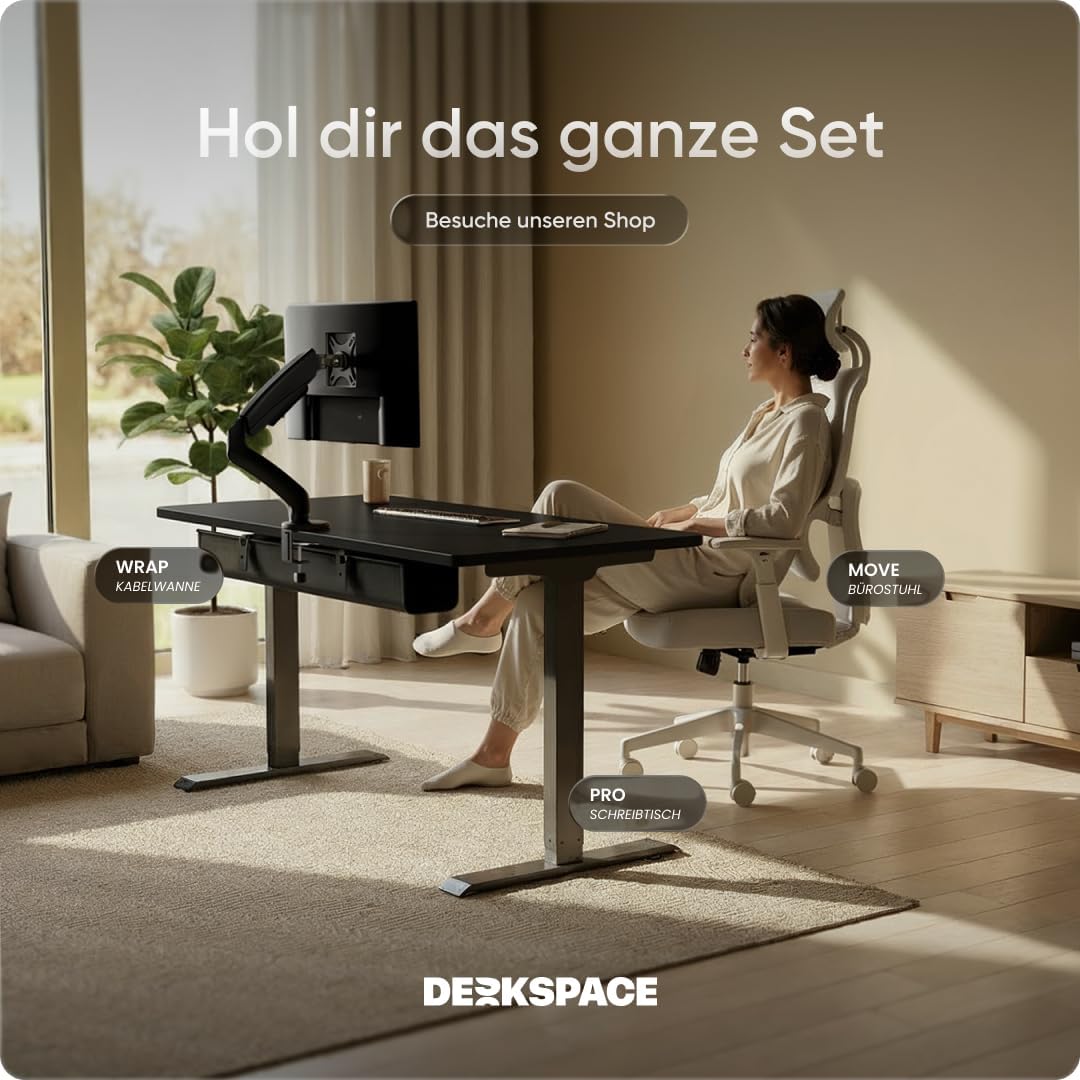 Das DESKSPACE PRO Gestell ist sehr stabil und läuft leise, die Höhenverstellung mit Memory-Funktion macht den Wechsel zwischen Sitzen und Stehen unkompliziert, der integrierte USB-Anschluss ist praktisch und der Kollisionsschutz gibt zusätzliche Sicherheit. Die Montage war einfach und die 5 Jahre Gewährleistung sorgen für ein gutes Gefühl – klare Kaufempfehlung.
