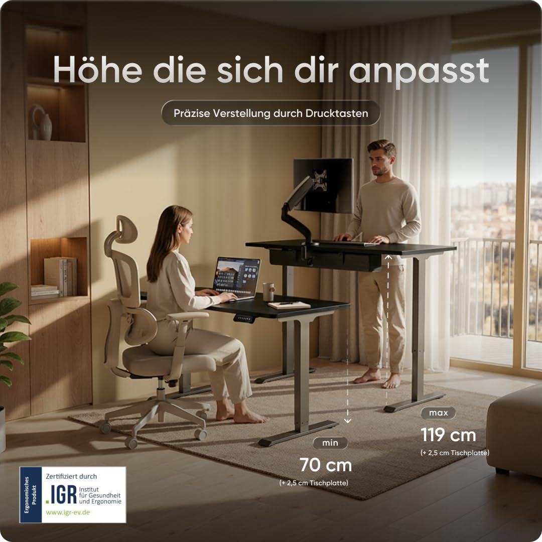 - GESTEIGERTE PRODUKTIVITÄT FÜR JEDEN – Durch das 70 bis 119 cm beliebig verstellbare Tischgestell ist das Modell perfekt für kleine und große Menschen geeignet. Laut Studien wird durch einen elektrisch höhenverstellbaren Arbeitstisch die Produktivität beim Arbeiten deutlich erhöht.