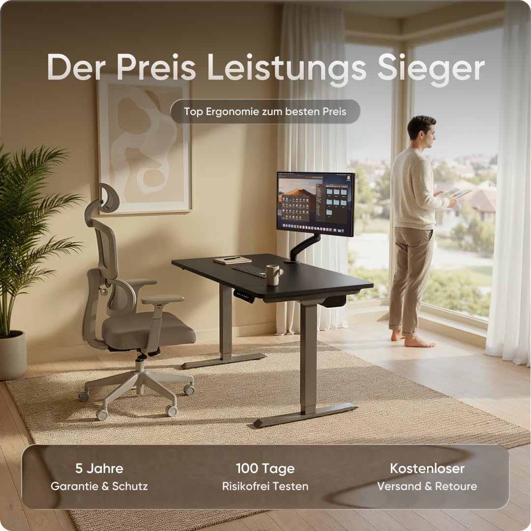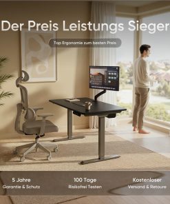 - 100 TAGE TESTPHASE UND 5 JAHRE GEWÄHRLEISTUNG – Wir bieten eine 100-tägige Testphase an. Eine Rückgabe des höhenverstellbaren Bürotischs ist möglich. Sollte es Probleme mit dem Tischgestell geben, wird das betroffene Teil im Rahmen der Gewährleistung repariert oder ersetzt.