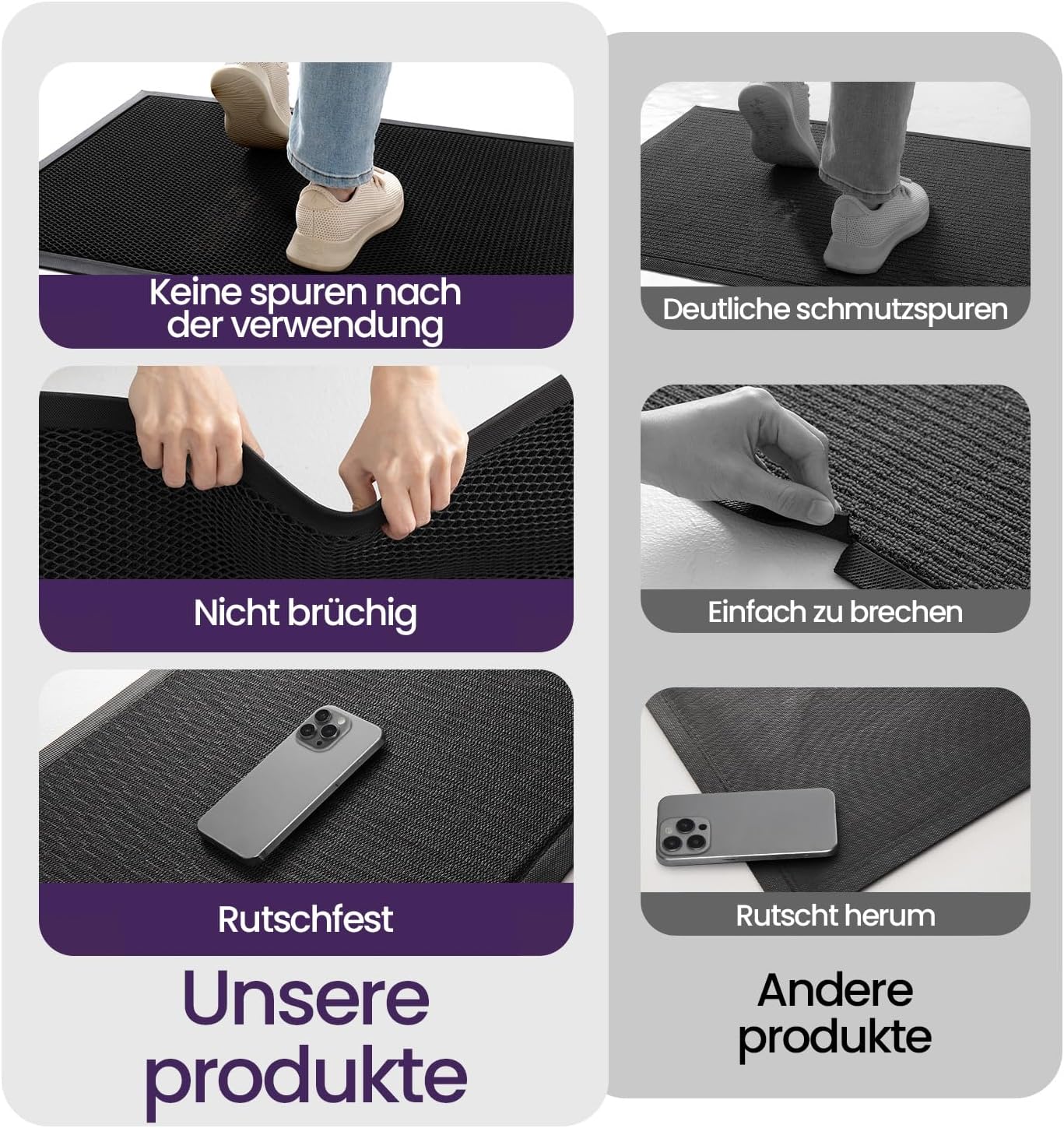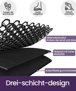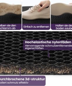 Die Fußmatte ist stabil verarbeitet, liegt sicher ohne zu rutschen und fängt Schmutz sowie Feuchtigkeit zuverlässig ab. Sie wirkt langlebig, lässt sich leicht reinigen und behält auch bei regelmäßigem Gebrauch ihre Form, sodass sie eine praktische und unaufgeregte Lösung für den Außenbereich ist.