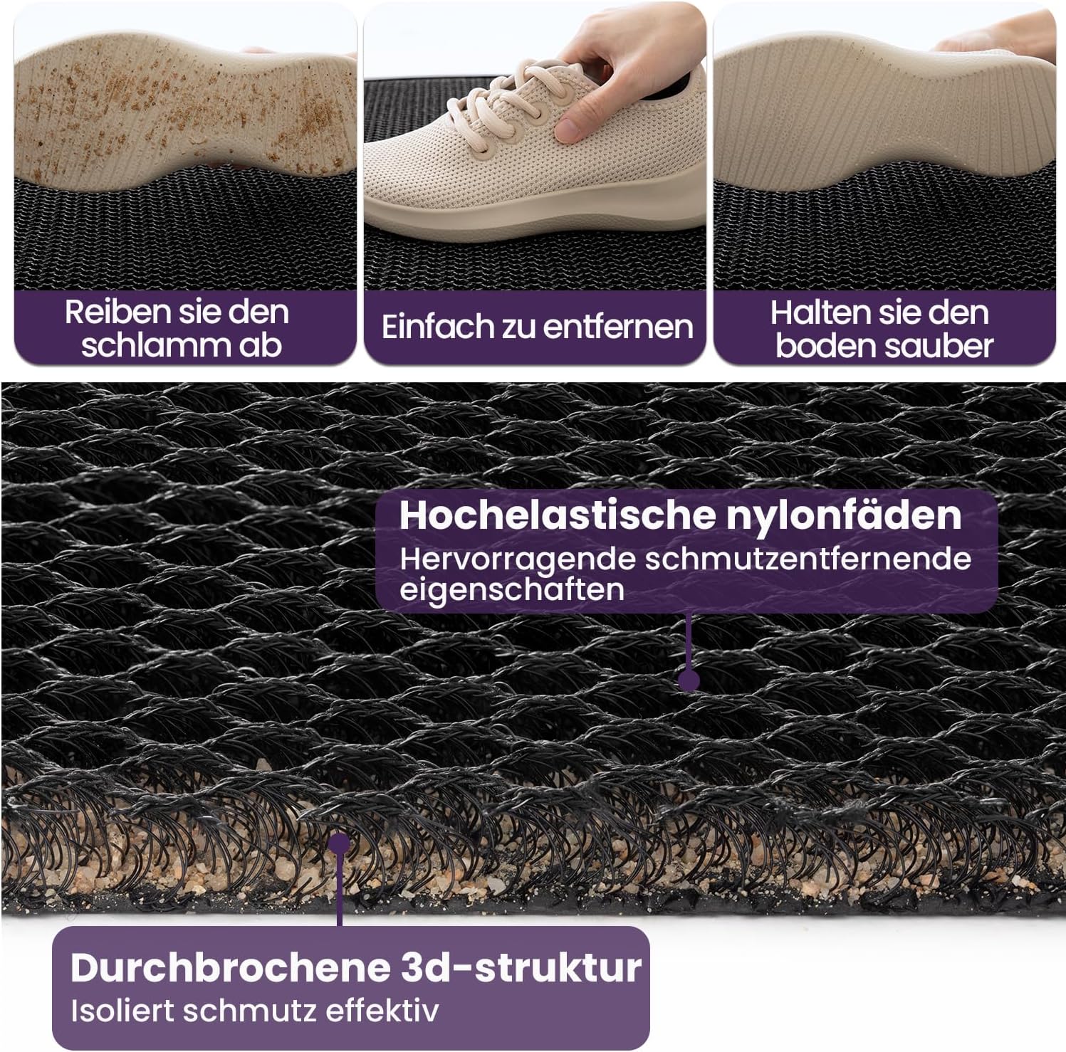 - EFFICIENT DUST REMOVAL The special design with a hollow mesh system removes dirt, sand and snow from the shoes and catches the dirt deep inside the mat. This outdoor doormat absorbs moisture quickly and prevents puddles indoors – even with salt and dirt in winter