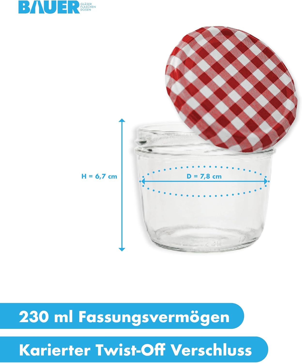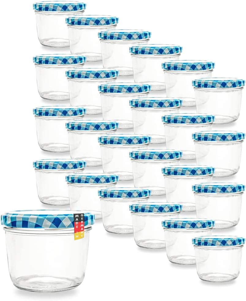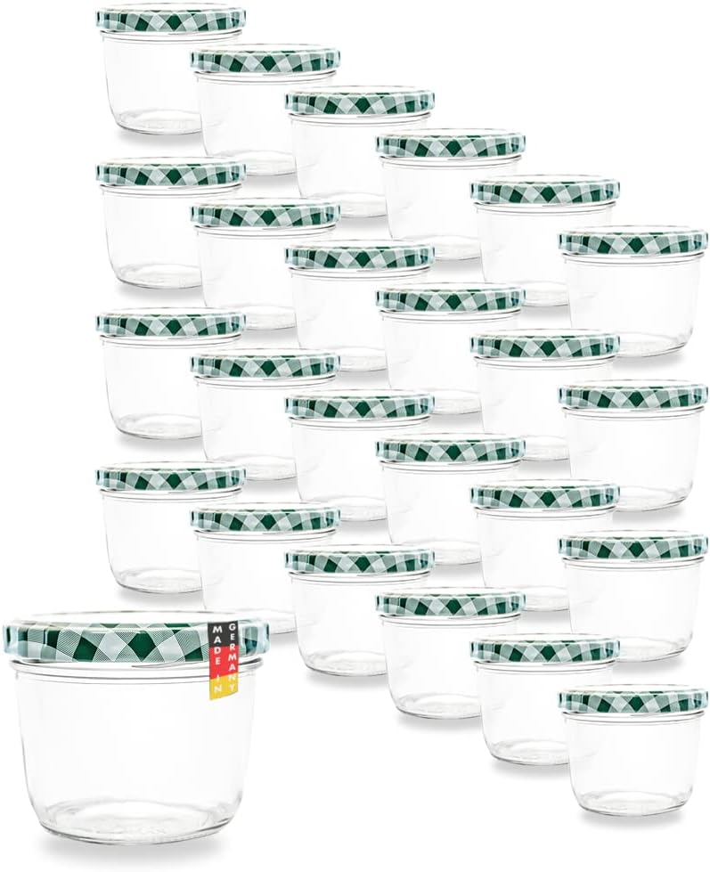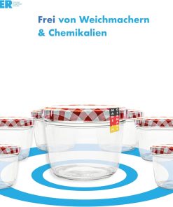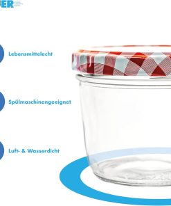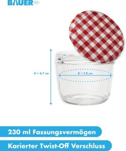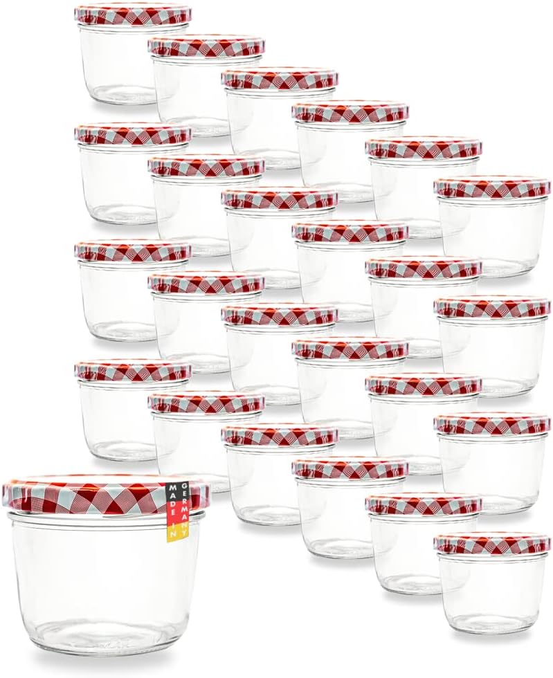 Flaschenbauer 24er Set Premium Sturzgläser 230 ml – Vielseitige Marmeladengläser & Einmachgläser mit farbigem Twist-Off-Deckel, inklusive Etiketten. Ideal für Suppen, Dips, Tee, Kräuter (Rot-Kariert)