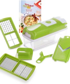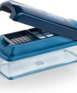 Mit dem 6-teiligen Nicer Dicer smart Set bleiben keine Wünsche offen. Endlich sparen Sie sich das lästige Schneiden in der Küche – das Nicer Dicer smart Set nimmt Ihnen viel Arbeit ab! Entdecken Sie auch den praktischen Auffangbehälter mit einem Fassungsvermögen von 800 ml – für das direkte Schneiden der Zutaten. Was darf es sein? Würfel und Stifte in verschiedenen Größen, dünne Scheiben – all das ist mit dem 6-teiligen Nicer Dicer smart Set kein Problem mehr, mit wenigen Handgriffen erledigt und kinderleicht zu bedienen. Mit den Messereinsätzen bringen Sie Ihr Gemüse in die gewünschte Form. Einfach die Messereinsätze in das Schneidunterteil einlegen, das Gemüse auflegen und das Schneidoberteil mit Schwung nach unten drücken. Das geschnittene Gemüse fällt nun in den Auffangbehälter. Anschließend können Sie den Inhalt bequem weiterverarbeiten – zum Beispiel zu einem leckeren, frischen Salat oder zu einer bunten Gemüsepfanne. Das 6-teilige Nicer Dicer smart Set ist nicht nur platzsparend und praktisch in der Anwendung, sondern auch sehr leicht zu reinigen: Der Schneiddeckel ist mit einer Selbstreinigungsfunktion ausgestattet, außerdem können Sie den Nicer Dicer smart einfach in die Spülmaschine geben und müssen ihn nicht von Hand spülen. Mühelos, schnell und ohne Strom lassen sich mit dem 6-teiligen Nicer Dicer smart Set Salate, Obst- und Gemüsegerichte im Handumdrehen zubereiten.