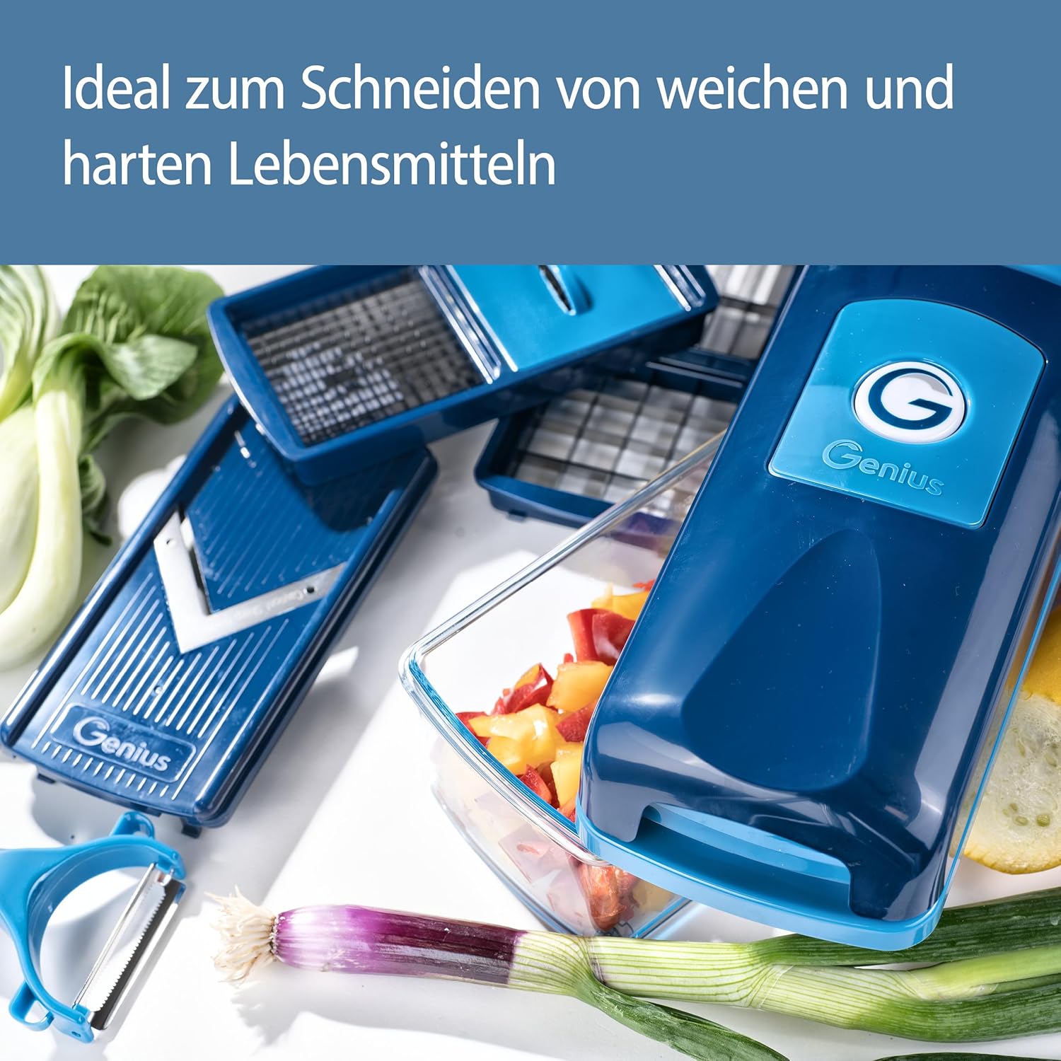 - 2 in 1 Messereinsätze für das gleichzeitige Schneiden unterschiedlicher Zutaten!