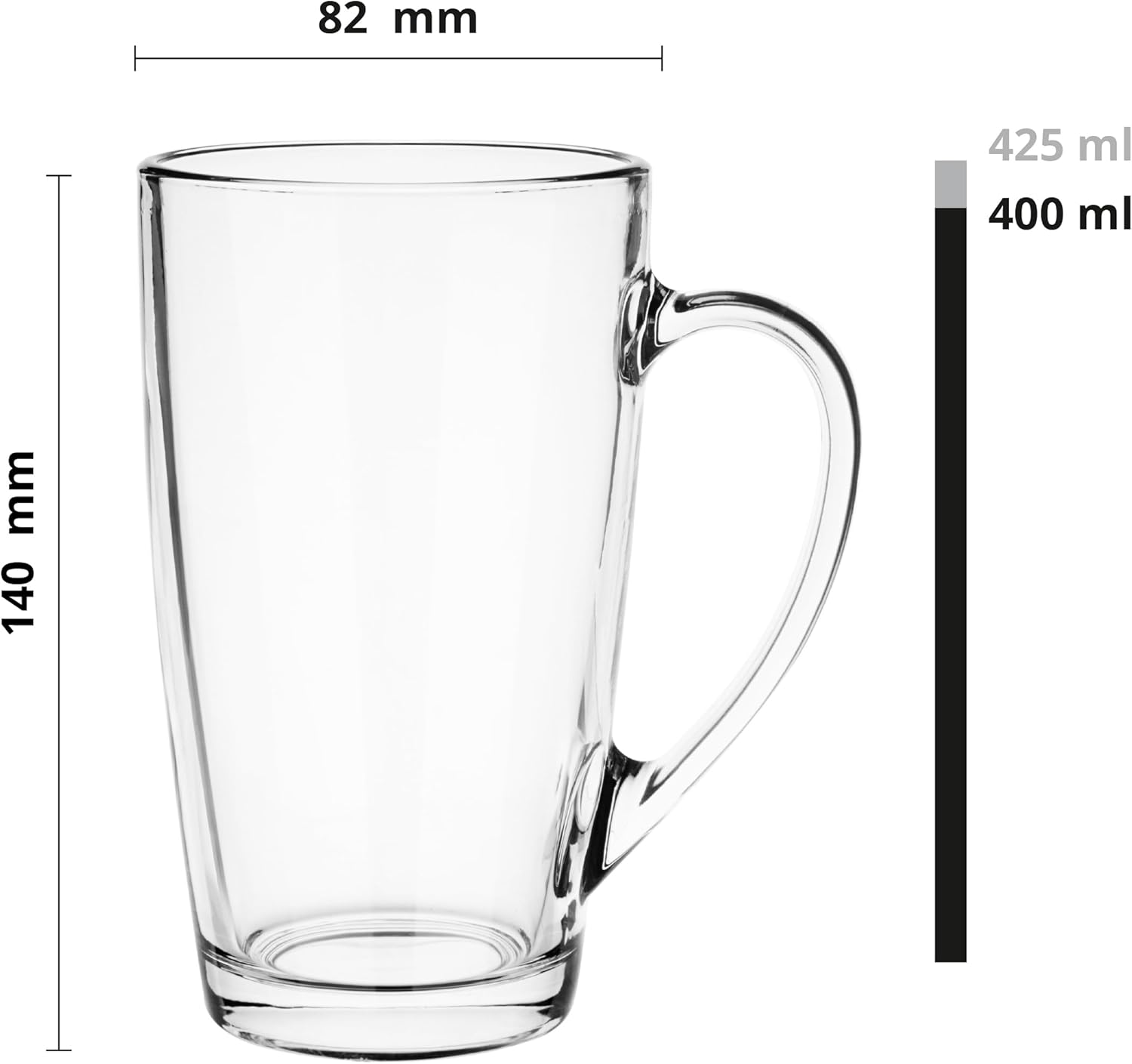 Tolles Gläser-Set: die Becher sind stabil, haben angenehme Henkel und reichen mit 400 ml gut für Kaffee oder Tee. Das klare Design passt zu vielen Küchen und sie kommen problemlos sauber aus der Spülmaschine. Bin sehr zufrieden mit Qualität und Preis-Leistung.