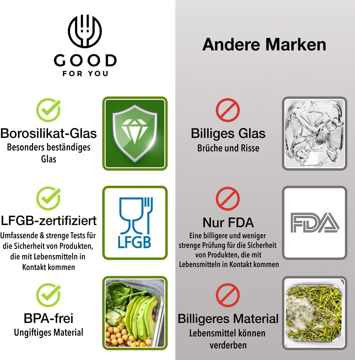 - Lebensmittelecht – mit 2 Jahren Garantie & Support Unsere meal prep gläser sind sicher für den täglichen Kontakt mit Lebensmitteln und für den vielseitigen Einsatz geeignet. Wir bieten auf alle frischhaltedosen mit deckel eine 2-jährige Garantie – bei Problemen sorgt unser Kundenservice für Ersatz oder Erstattung.