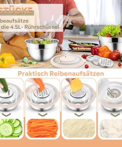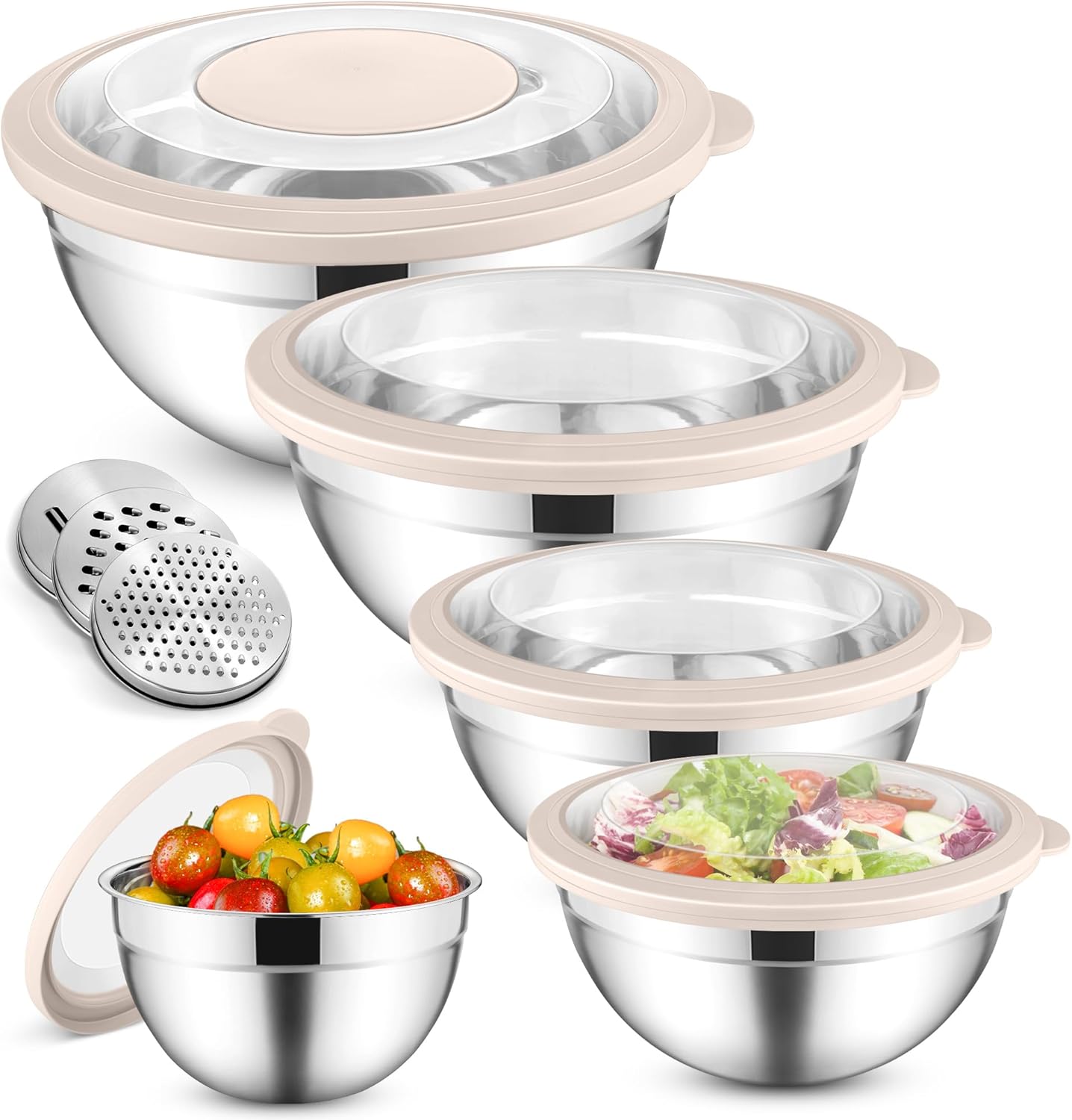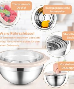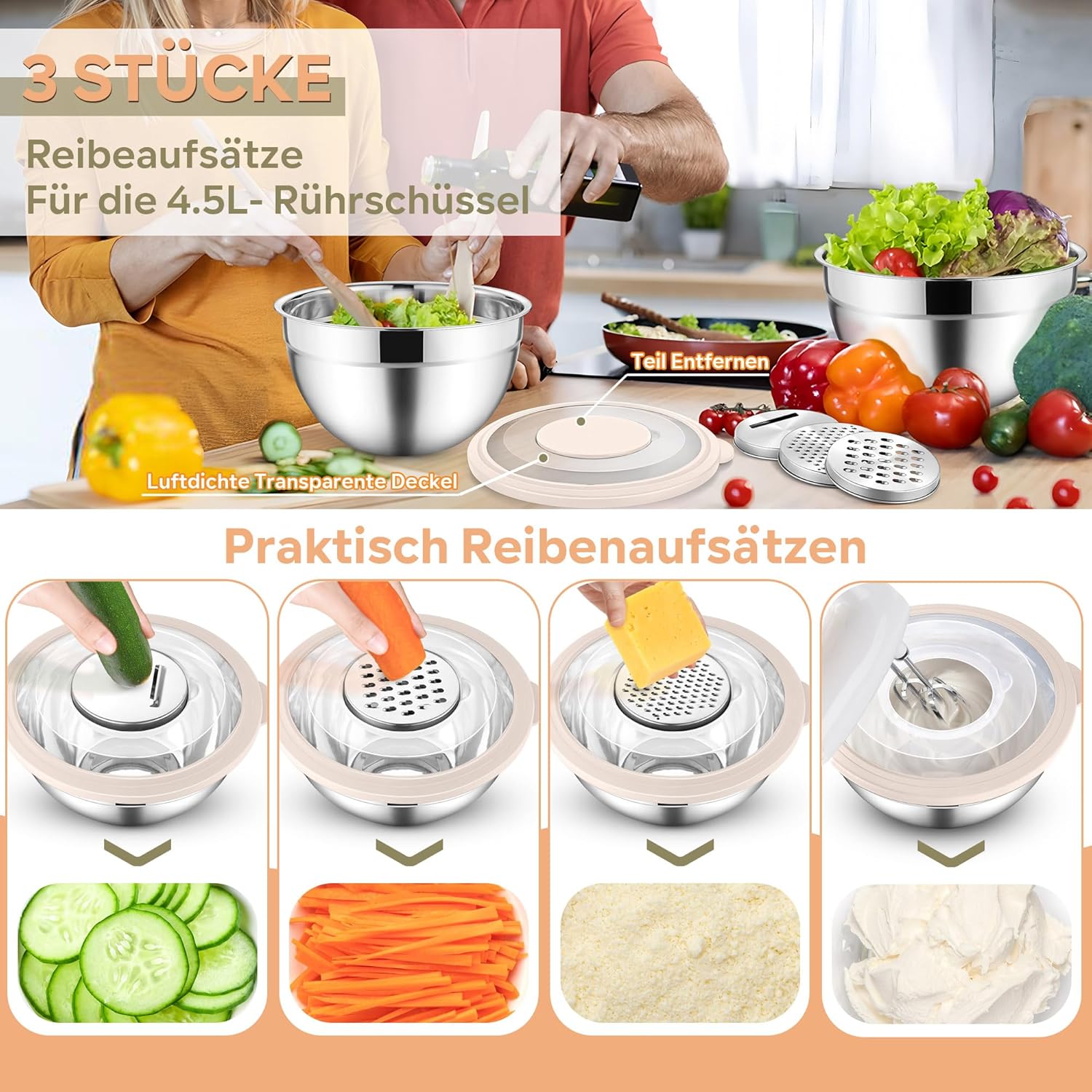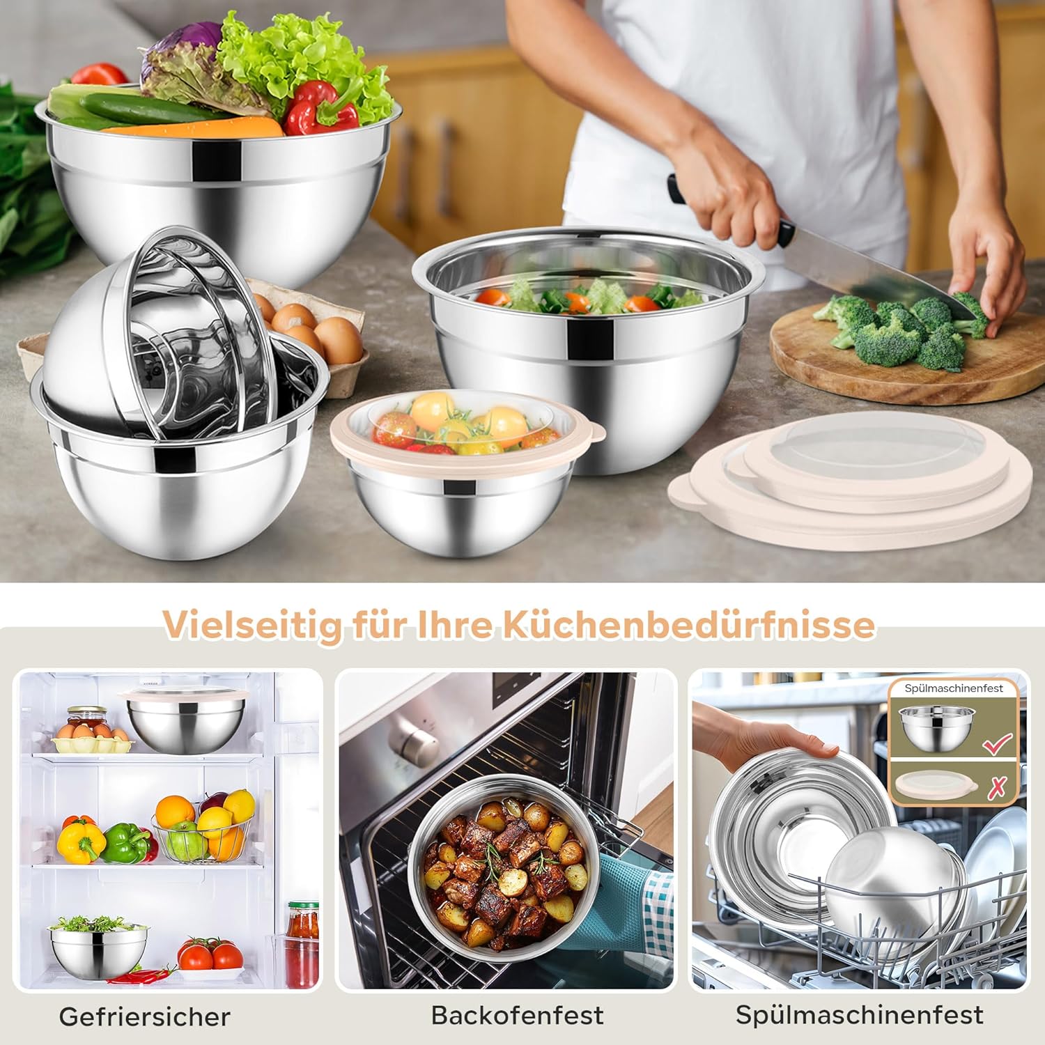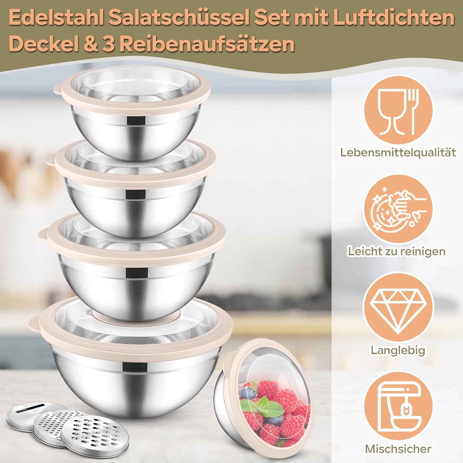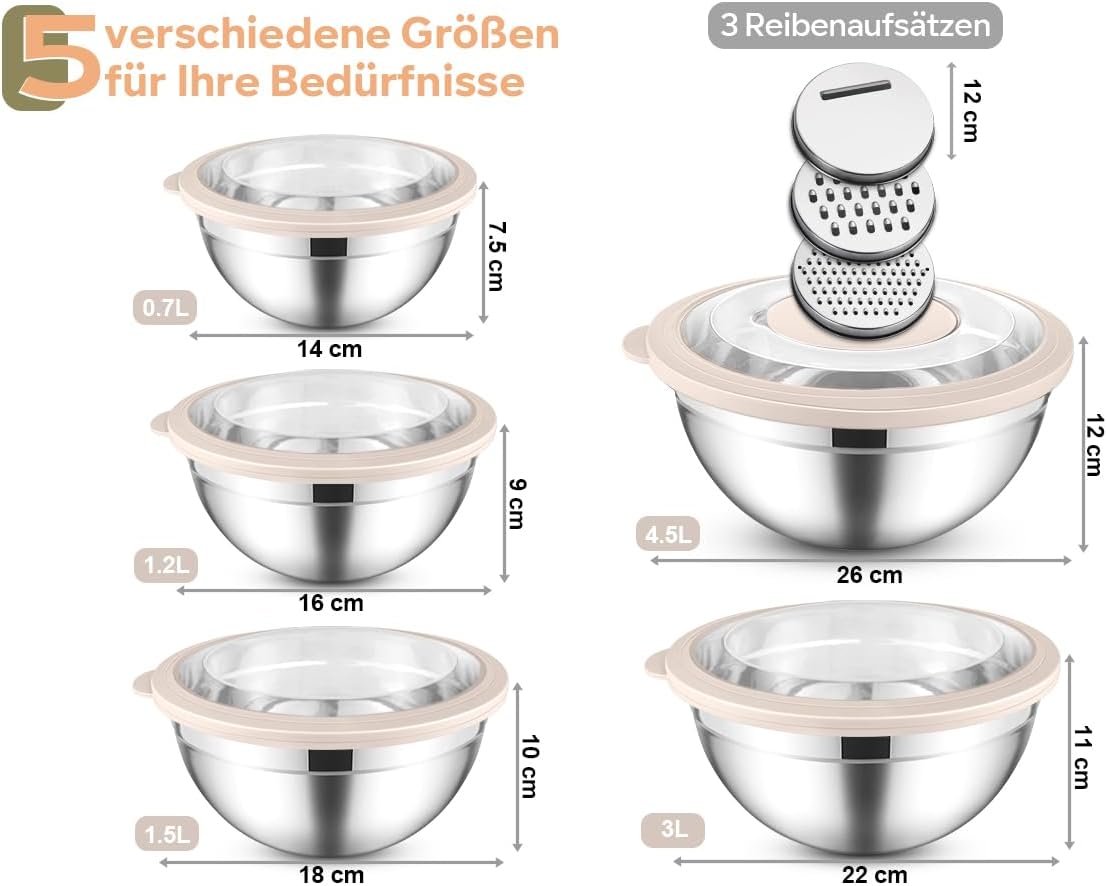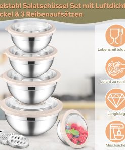 Praktisches Set aus robustem Edelstahl – die fünf Schüsseln in verschiedenen Größen decken alle Küchenaufgaben ab, die transparenten, luftdichten Deckel halten frisch und die drei Reibeaufsätze sind ein nützliches Extra. Die Schüsseln lassen sich gut stapeln, sind spülmaschinenfest und die khakifarbene Optik wirkt hochwertig. Ich nutze sie regelmäßig zum Rühren, Aufbewahren und Servieren und bin sehr zufrieden mit Qualität und Verarbeitung.