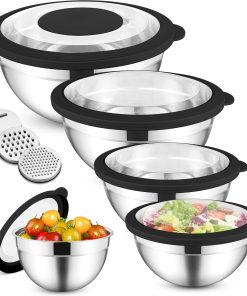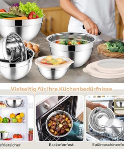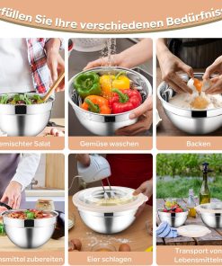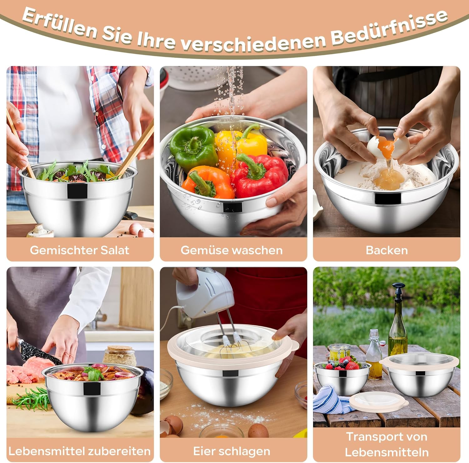 - Verschachtelbares & Platzsparendes Schüsselset – Edelstahl Salatschüssel mit Deckel Set kann leicht ineinander verschachtelt werden, um Speicherplatz zu sparen und Ihre Küche ordentlich und organisiert zu halten, Das tiefe Schüsseldesign fasst mehr Lebensmittel, ohne beim Mischen zu spritzen, Der breite, gerollte Rand erleichtert das Greifen und Ausgießen, Das matte Äußere sorgt für bessere Kratzfestigkeit und das spiegelpolierte Innere für eine einfache Reinigung und ist spülmaschinenfest (Hinweis: Der Deckel kann nur von Hand gewaschen werden)