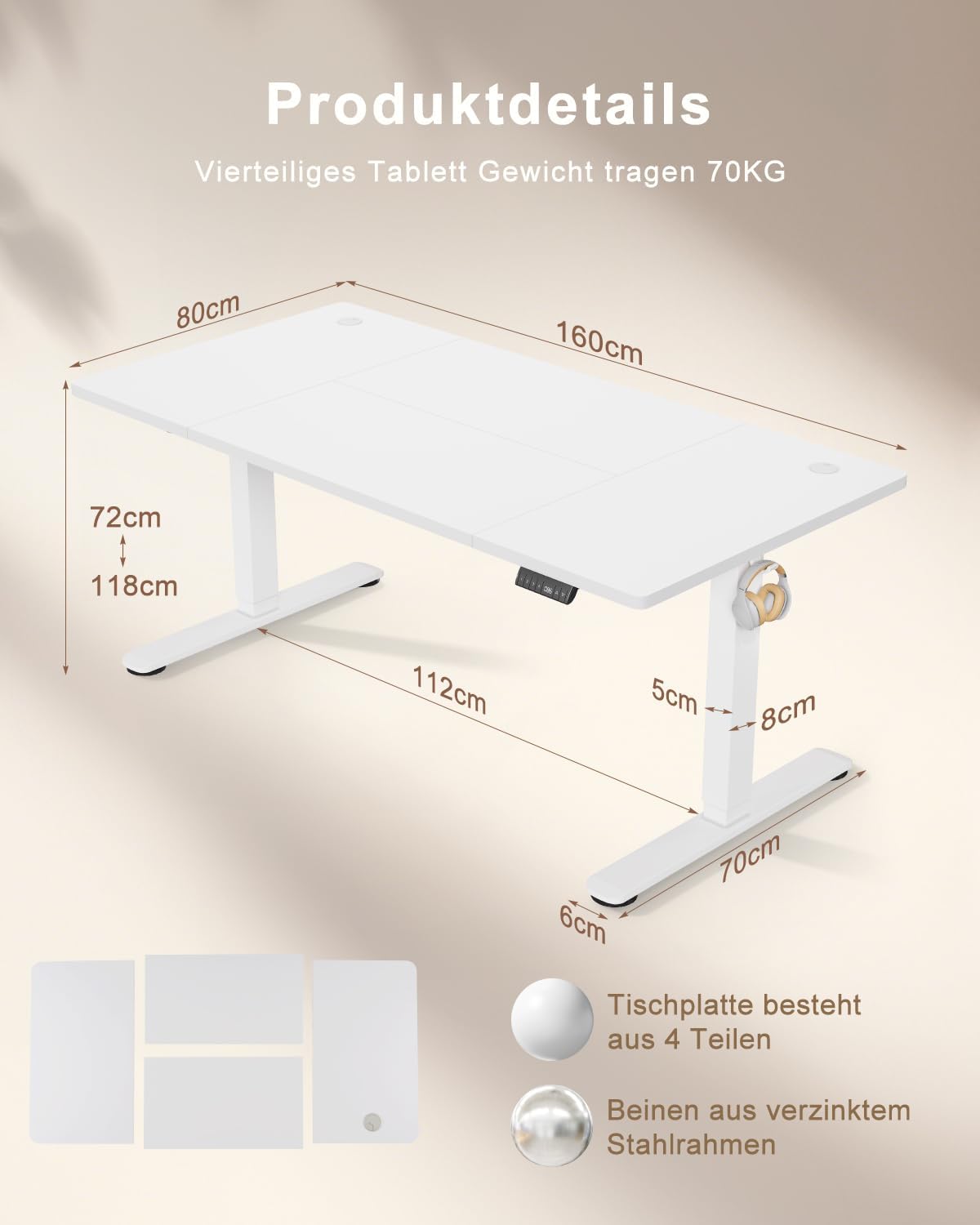 Der Schreibtisch ist von guter Qualität und funktioniert einwandfrei. Die Platte besteht aus vier Teilen und ist leicht zusammenzubauen; die mitgelieferten Holzdübel habe ich zusätzlich gesichert, kleine Flacheisen im Lieferumfang sichern die Platte vollständig. Der Aufbau ist einfach, die Anleitung verständlich, alle Teile waren vollständig (sogar Ersatzschrauben); allein dauerte es ca. 60 Minuten, zu zweit geht es schneller. Der Tisch ist elektrisch höhenverstellbar (3 feste Einstellungen plus individuell) und fährt schnell und leise hoch und runter ohne Ruckeln oder Wackeln. Insgesamt ein schöner, funktioneller Tisch zu einem sehr guten Preis – klare Kaufempfehlung!
