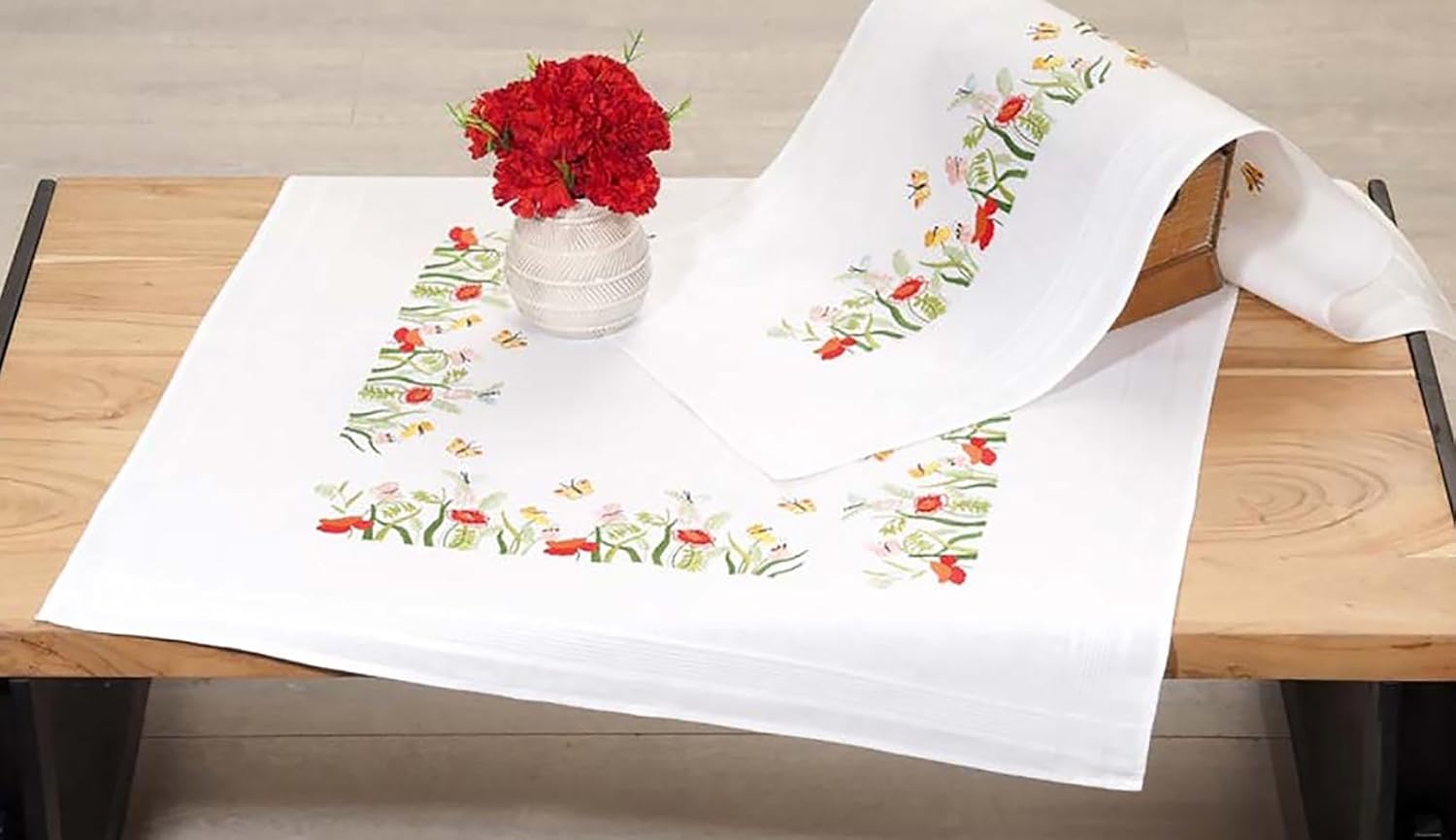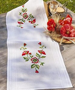 - This set contains the complete material: an exactly pre-printed tablecloth in 80 cm x 80 cm, detailed embroidery instructions shown with coloured graphics, pre-sorted embroidery thread and a embroidery needle suitable for the yarn and embroidery technique
