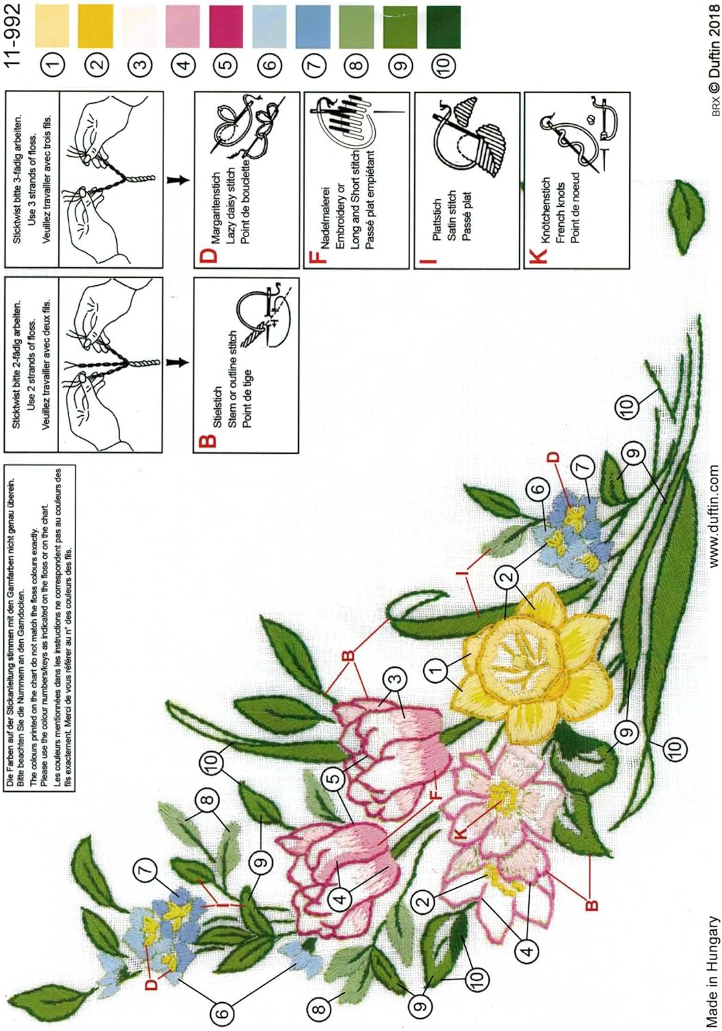 - Embroidery technique: flat stitch, stem stitch, needle painting, nodule stitch, margarite stitch, embroidery thread consists of 10 colours, the high-quality embroidery kit is made in Europe