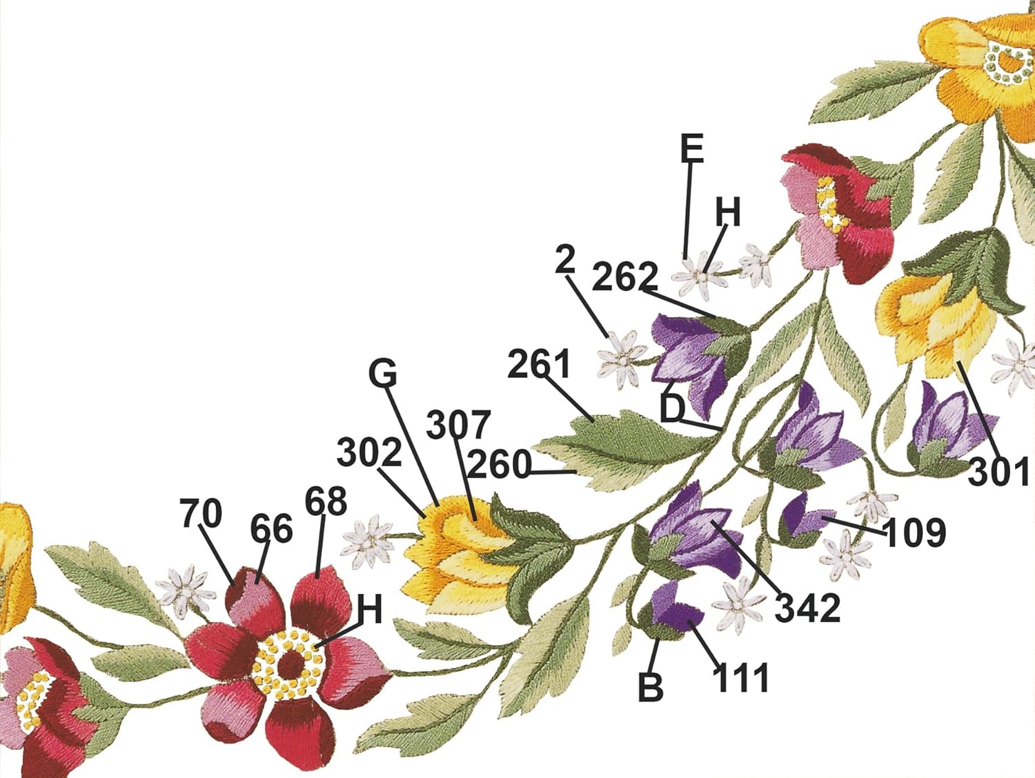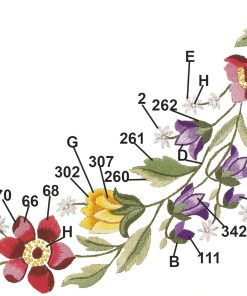 - Sticktechnik: Plattstich, Stielstich, Nadelmalerei und Schlingenstich, das Stickgarn besteht aus 13 Farben