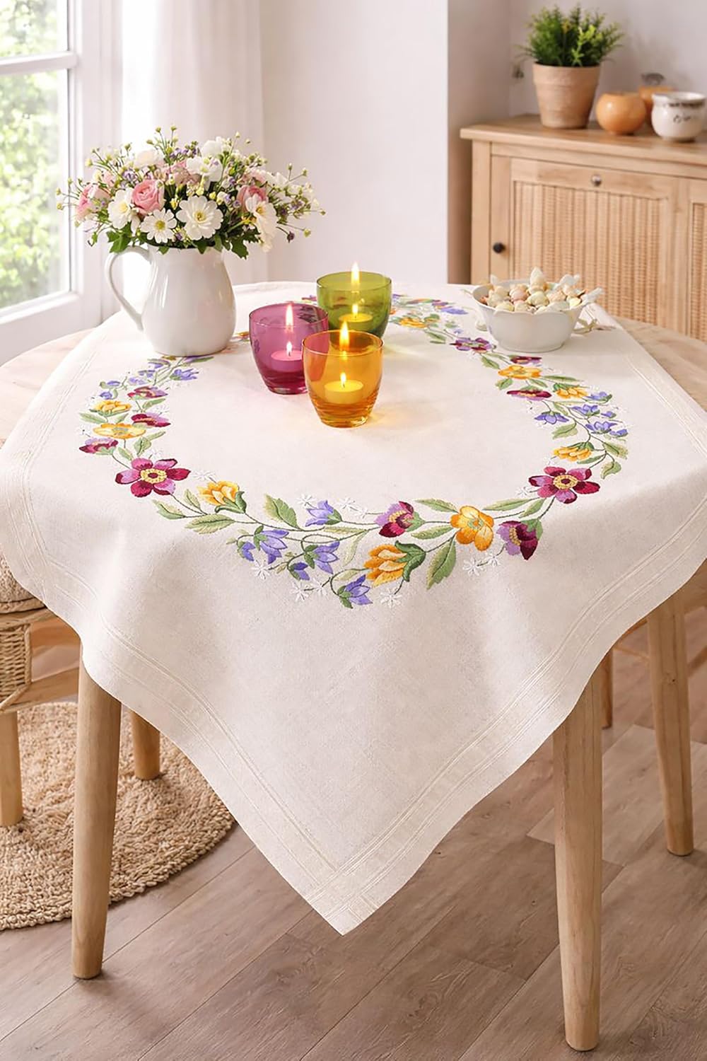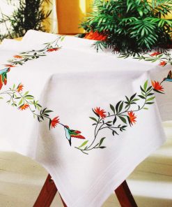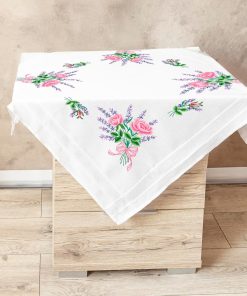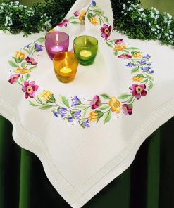 - Die Tischdecke hat ein vorgedrucktes Stickmuster und einen eingewebten Zierrand