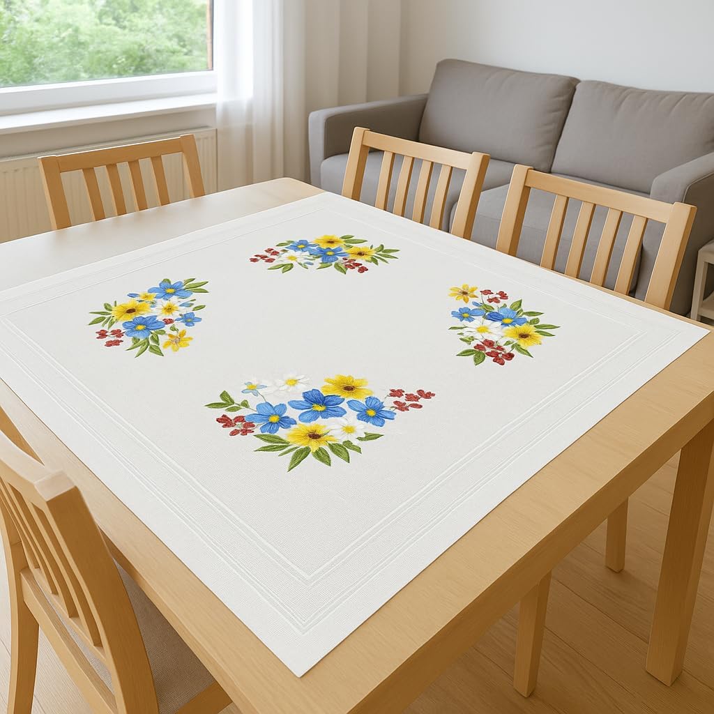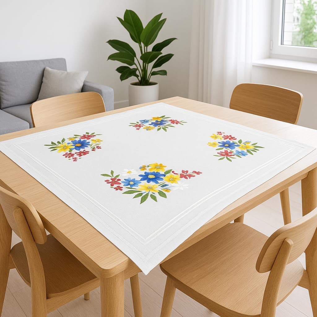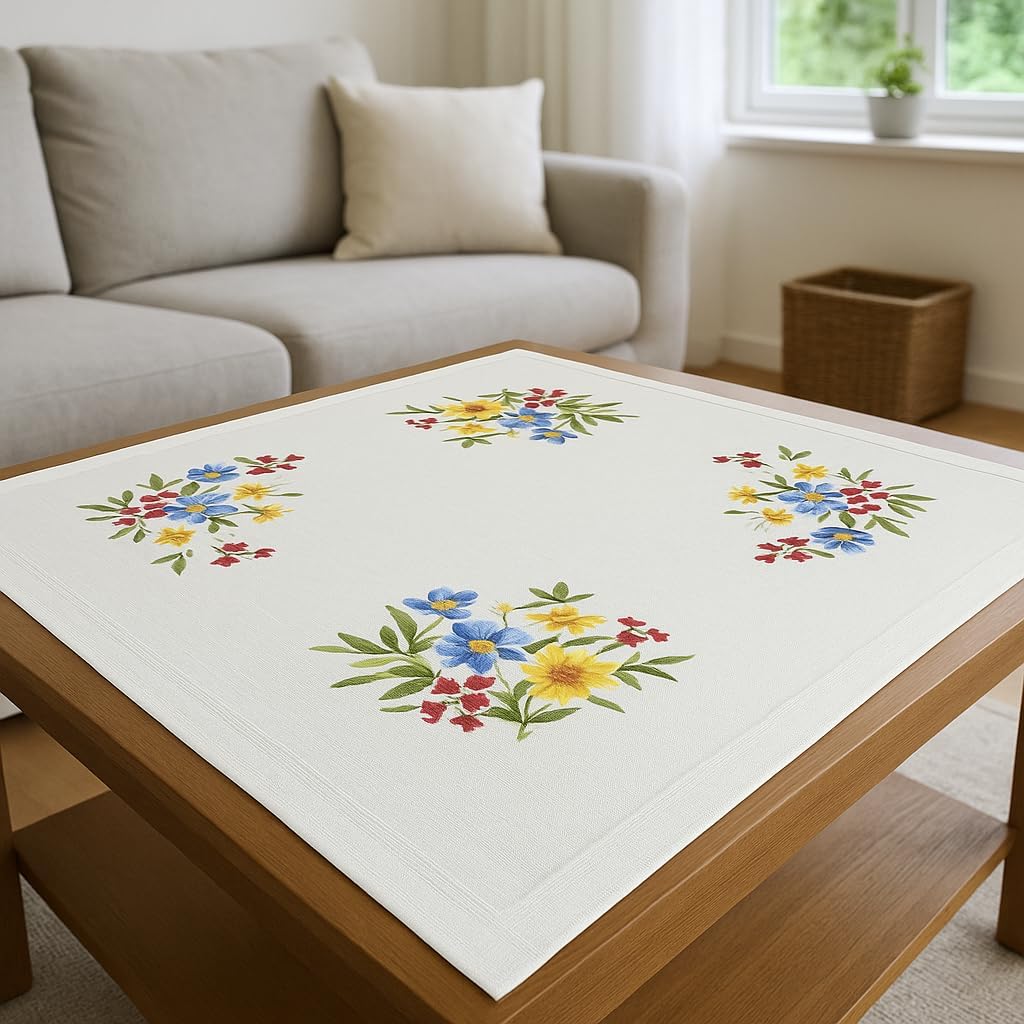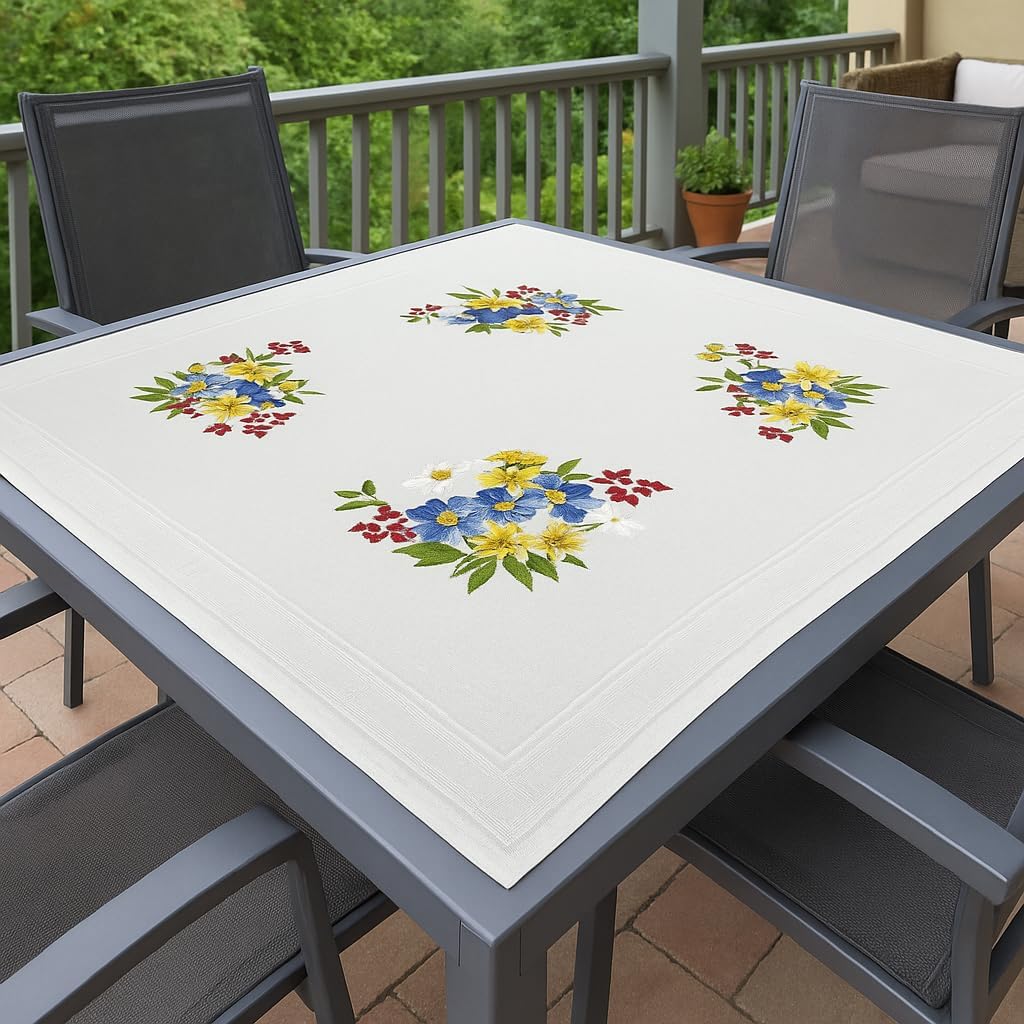 KAMACA Stickpackung Tischdecke Plattstich Stielstich Blumen vorgedruckte Stickdecke inkl. Stickgarn Stickvorlage und Anleitung Stickset zum Selbersticken für Erwachsene (Alpenblumen MD 80×80 cm)
