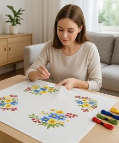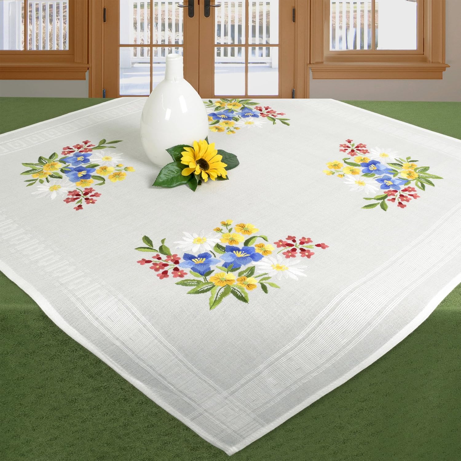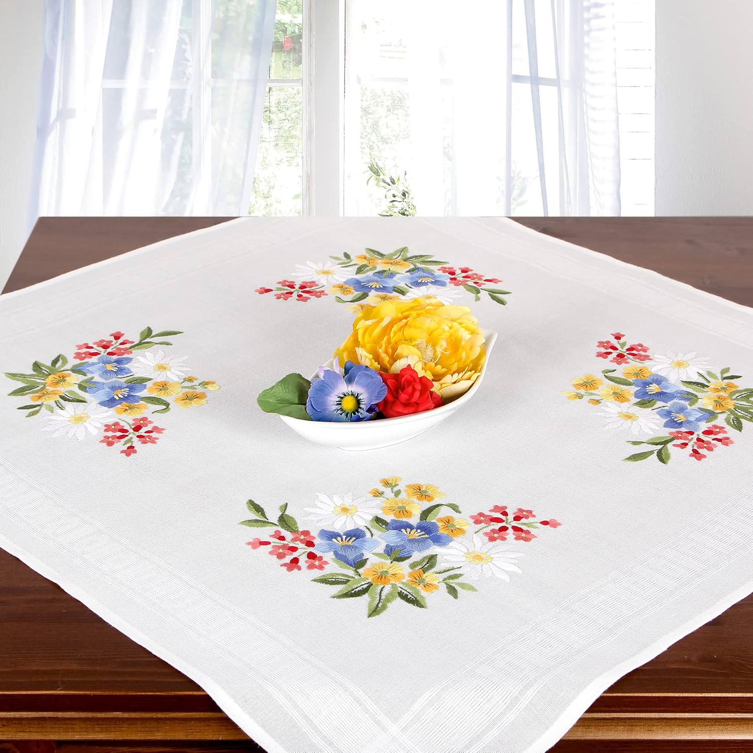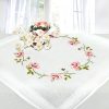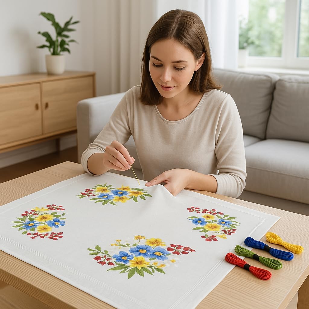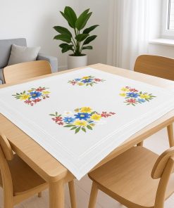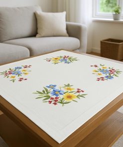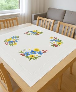 KAMACA Stickpackung Tischdecke Plattstich Stielstich Blumen vorgedruckte Stickdecke inkl. Stickgarn Stickvorlage und Anleitung Stickset zum Selbersticken für Erwachsene (Alpenblumen MD 80×80 cm)