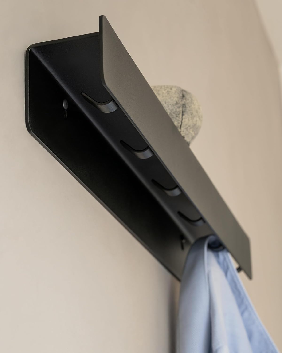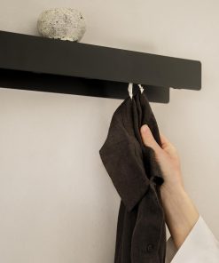 - Made from flat – solid stainless steel instead of aluminium. A finely textured powder coating provides a velvety matte surface that feels high quality – restrained in expression, consistent in effect. Durable wall hooks in everyday life, scratch-resistant in use – material that has noticeable substance