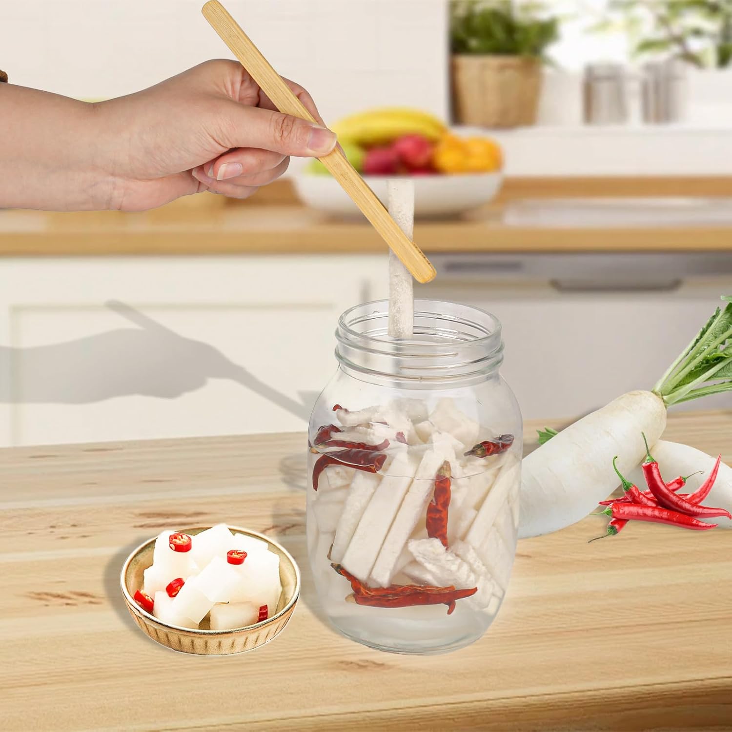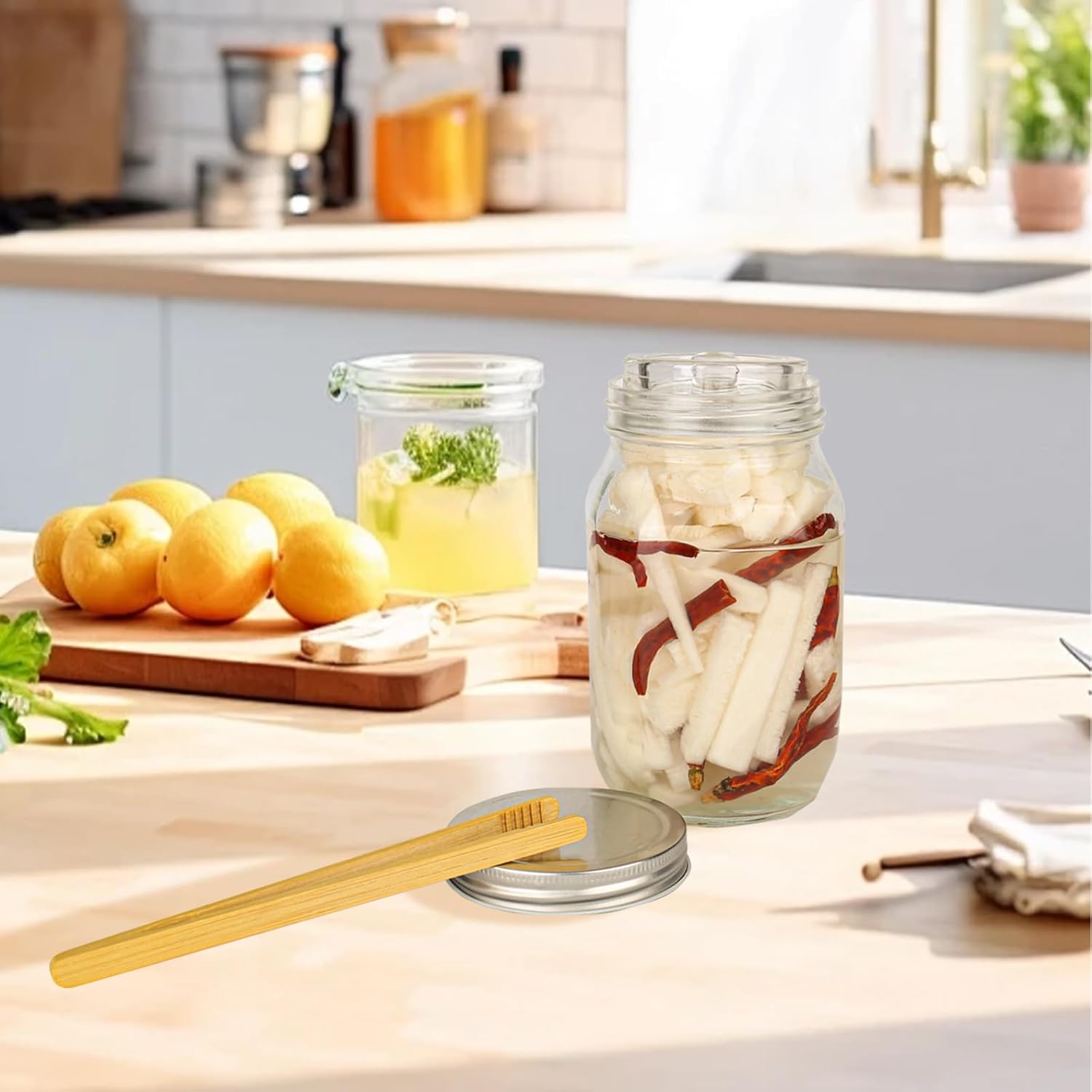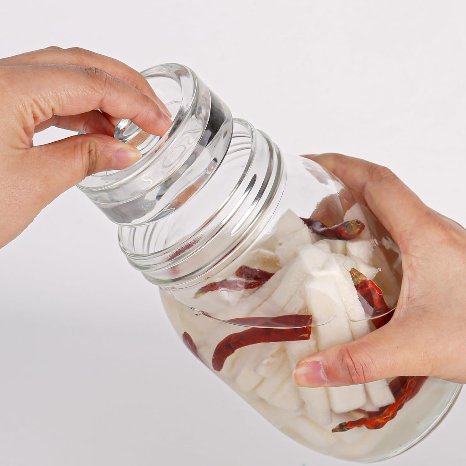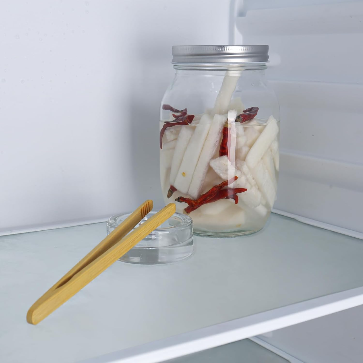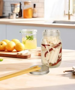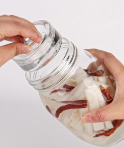 - Einfaches Einsetzen und Entfernen:Mehrzweck Vorratsgläser Um zu verhindern, dass Salzwasser herausspritzt, setzen Sie das Glasgewicht langsam mit einer Holzzange ein. Klemmen Sie die Seiten des Griffs fest und entfernen Sie ihn vorsichtig vom Flaschenhals.