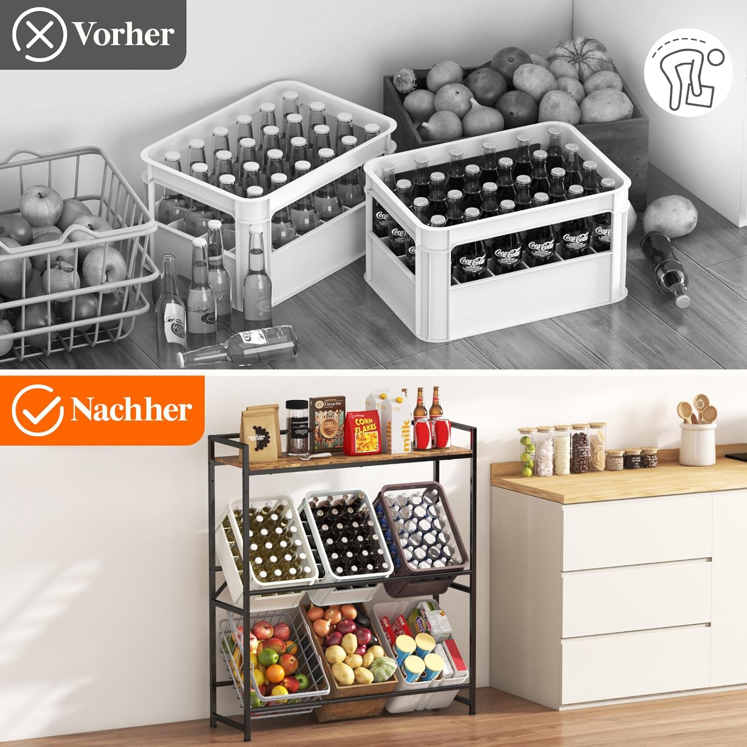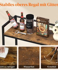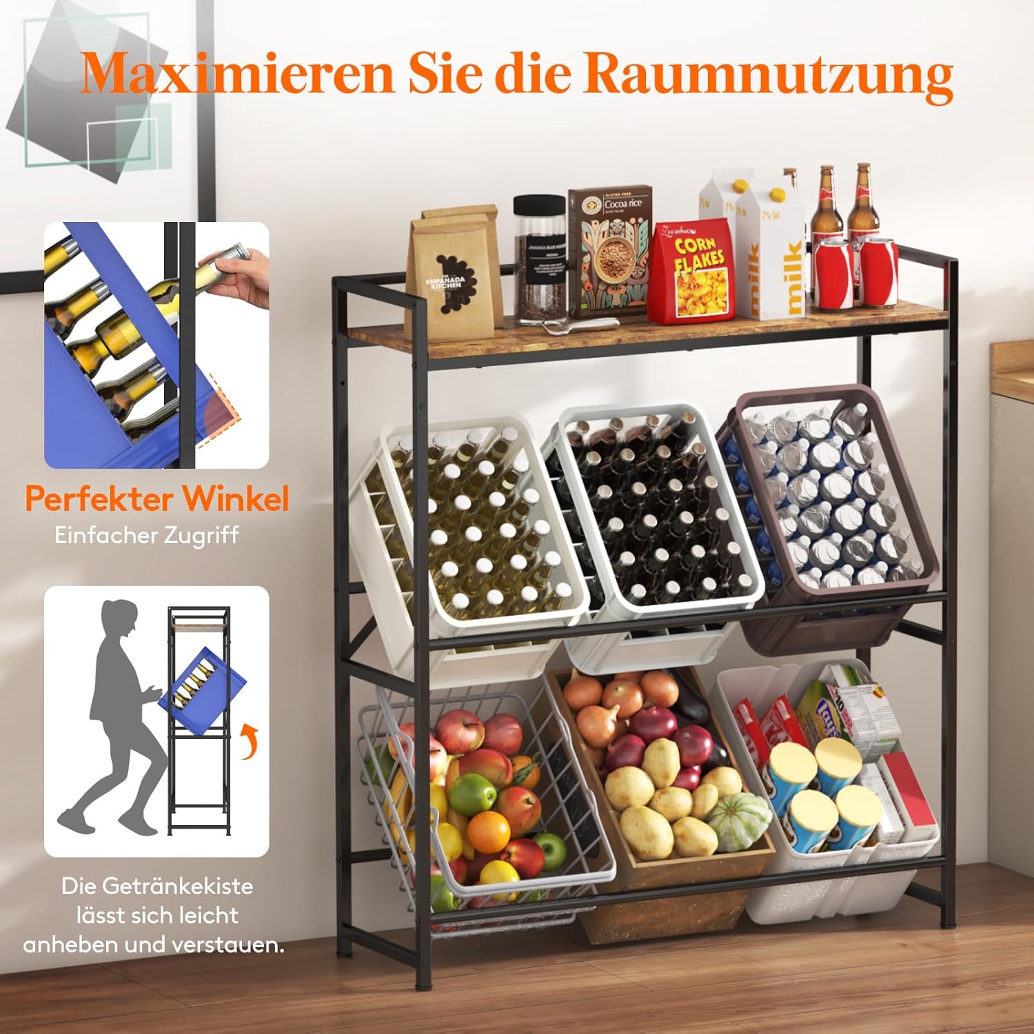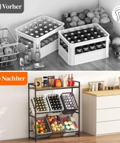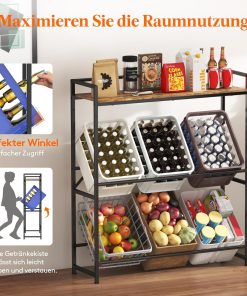 - Oberes Regal mit Reling: Die Oberseite des Kistenregal ist mit einem Halter ausgestattet, in dem Getränke, Kaffeebohnen, Saft, Milch usw. leicht zugänglich aufbewahrt werden können; maximale Belastung 40 kg