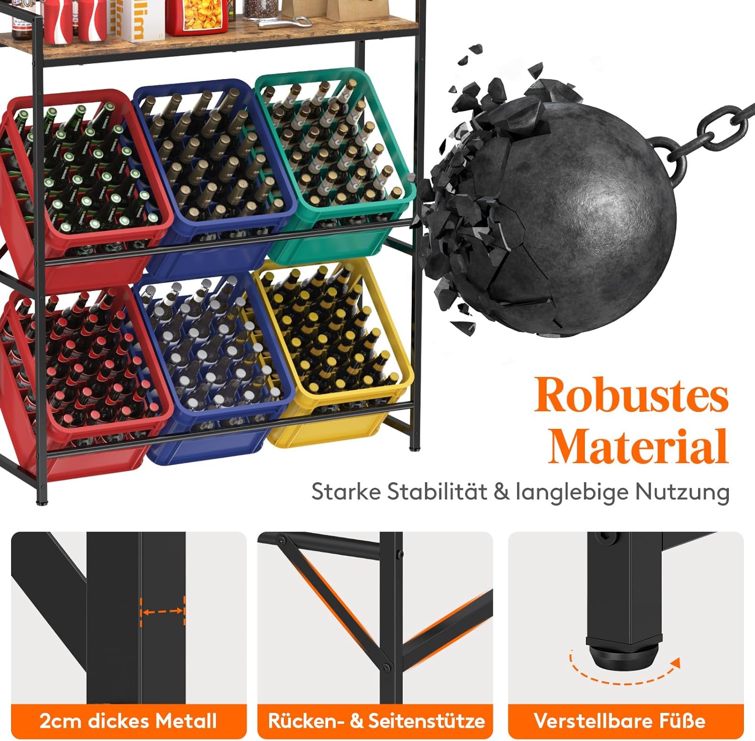 - Verstellbare Füße: Das Regal für Getränkekisten hat vier verstellbare Füße, die auch auf unebenen Böden für Stabilität sorgen; geeignet für Wohnzimmer, Abstellräume, Garagen oder Keller