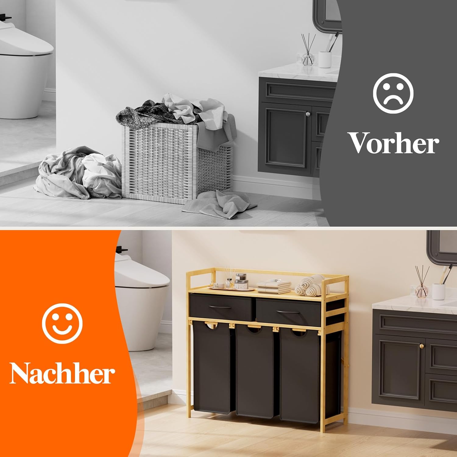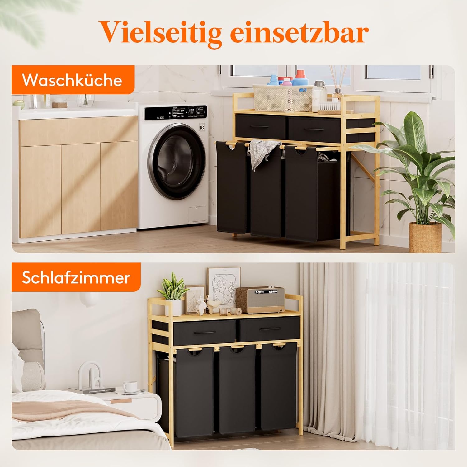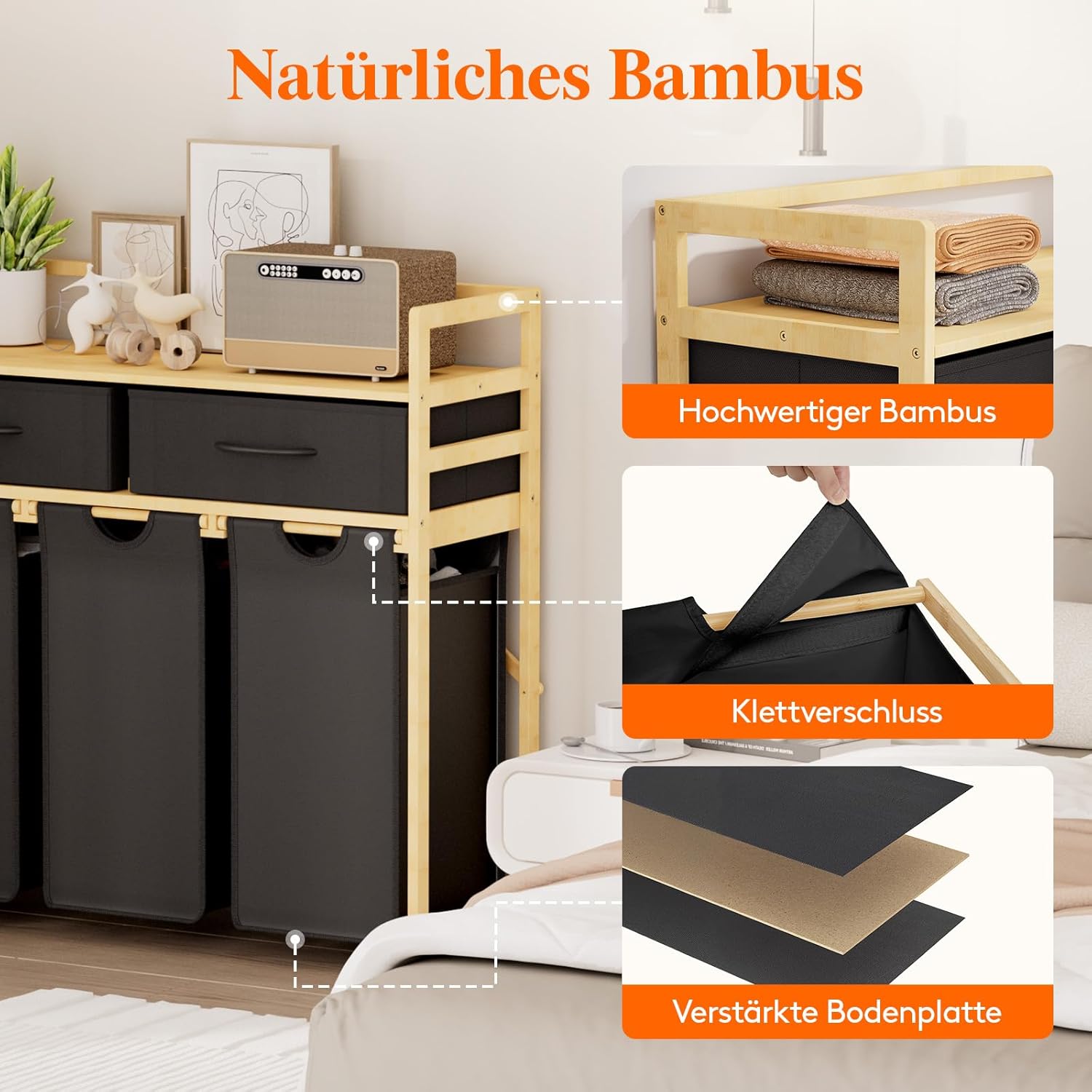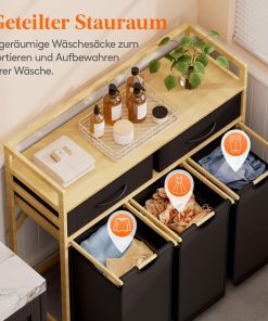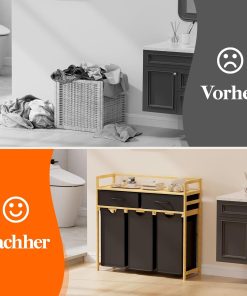 - Hochwertige Materialien: Der robuste Bambusrahmen und die verstärkten Körbe des Wäschesammlers aus Oxford-Gewebe garantieren eine lange Lebensdauer.