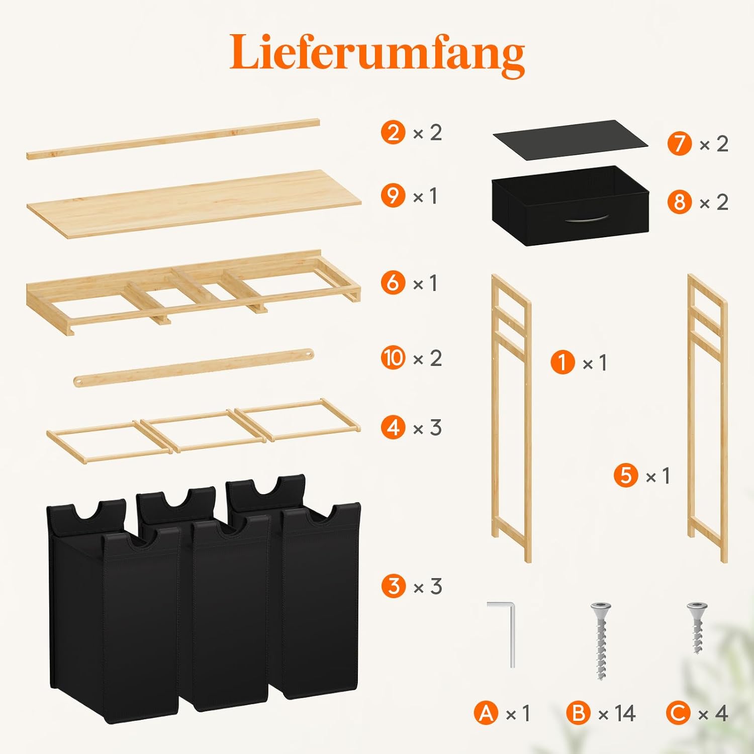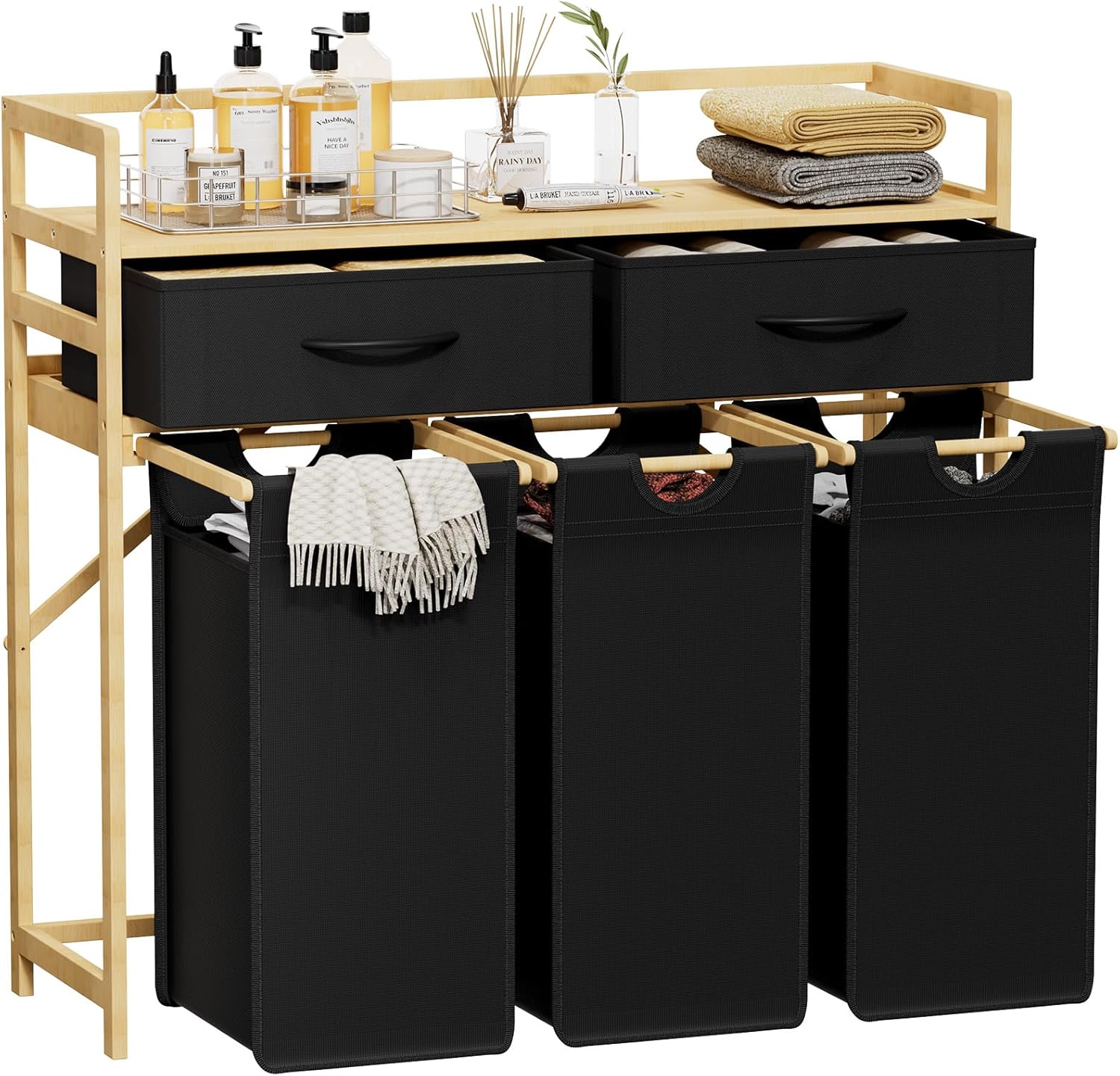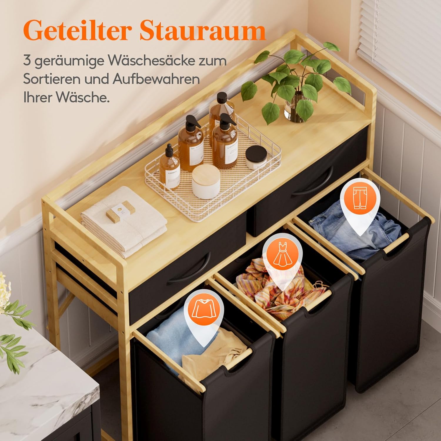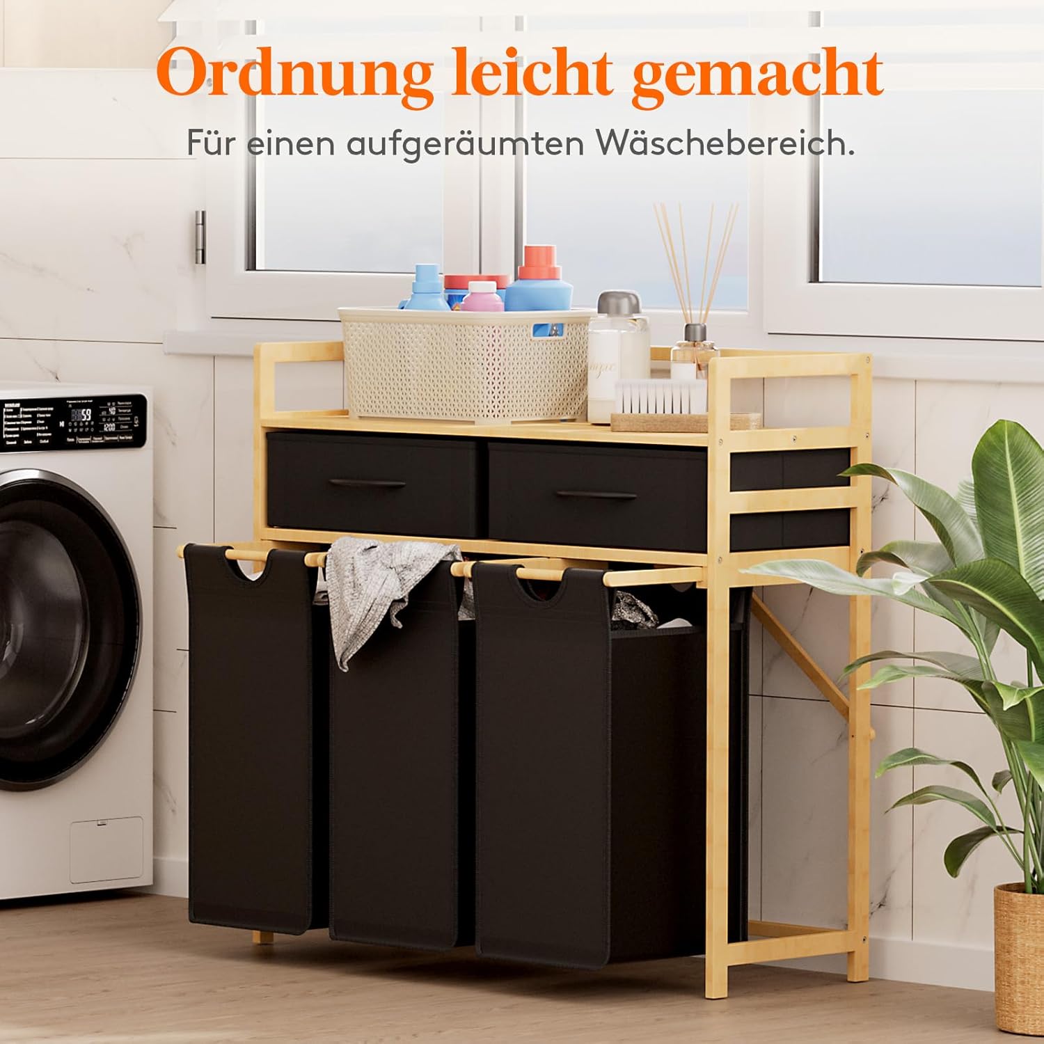 - Hochwertige Materialien: Der robuste Bambusrahmen und die verstärkten Körbe des Wäschesammlers aus Oxford-Gewebe garantieren eine lange Lebensdauer.