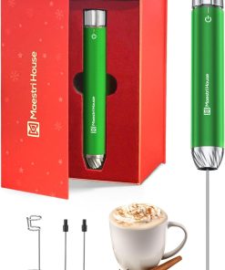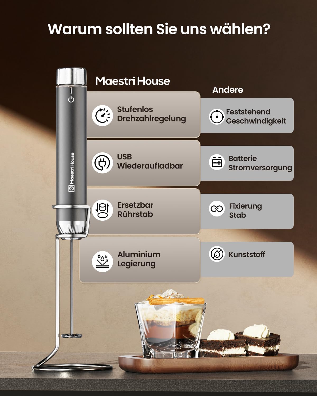 Der Maestri House LunaFro Max Milchaufschäumer überzeugt mit kräftigem, gleichmäßigem Aufschäumen dank stufenloser Geschwindigkeitsregelung und dem abnehmbaren Edelstahlschneebesen; das wasserdichte Gehäuse und die einfache Reinigung machen ihn im Alltag praktisch, die Akkulaufzeit ist solide und die Bedienung unkompliziert, sodass er zuverlässig cremigen Milchschaum für Latte und Co. liefert.