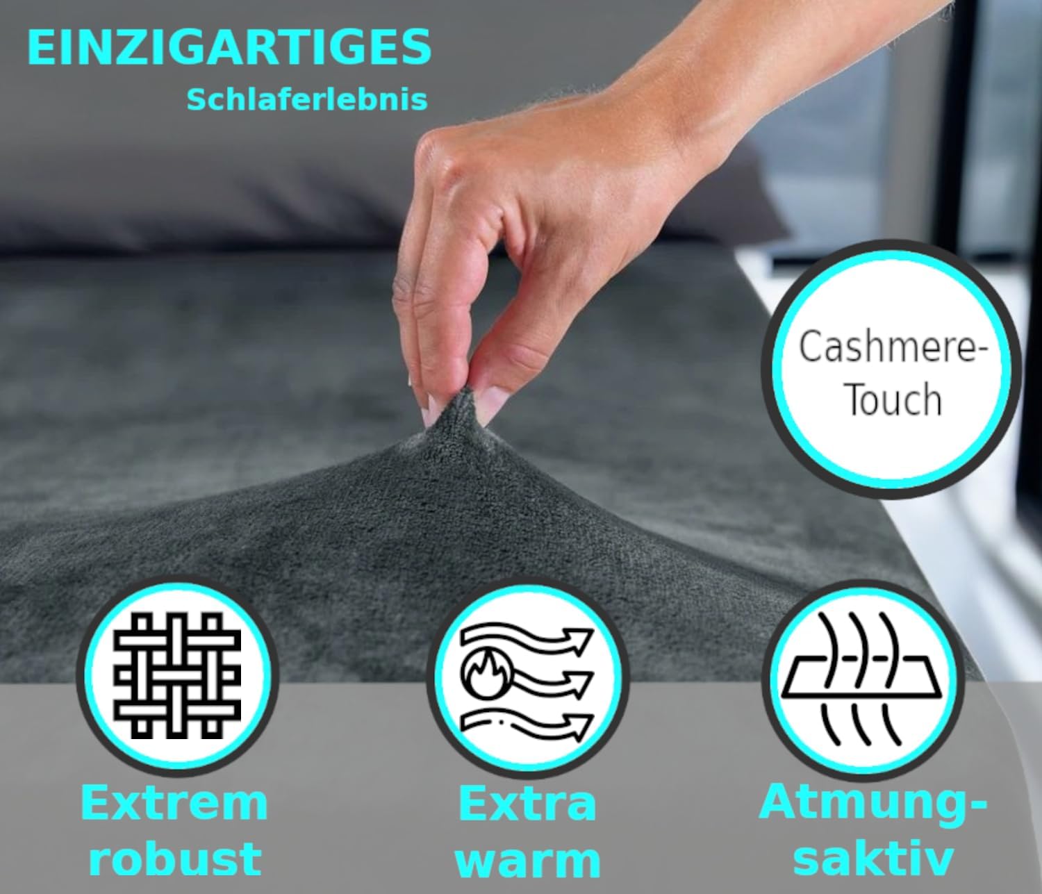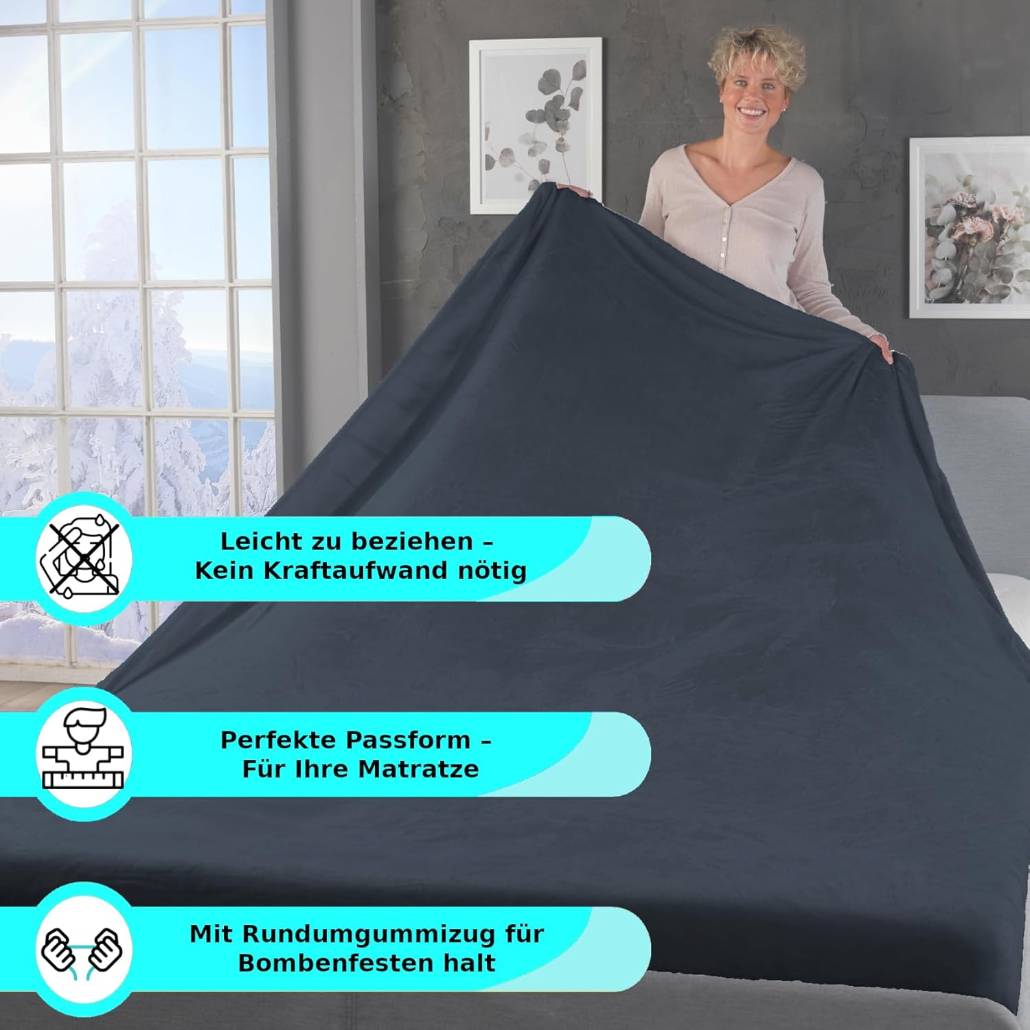 Tolles Spannbettlaken: Die Cashmere-Touch Oberfläche ist unglaublich weich und angenehm warm, das Jersey-Fleece sitzt straff auf der Matratze in 180-200 x 200 cm, die Anthrazit-Farbe wirkt edel und das Laken behält Form sowie Farbe auch nach mehreren Wäschen.
