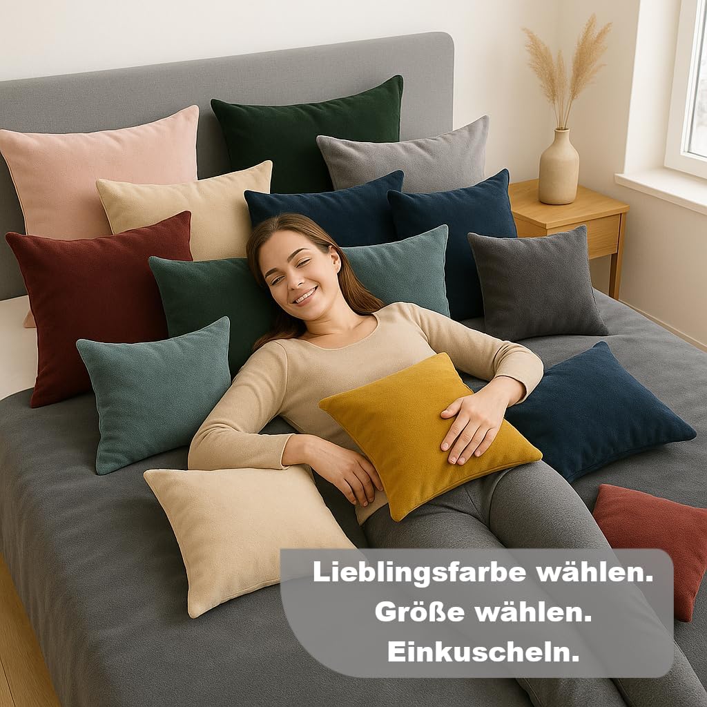Sehr weiche und hochwertige Kissenbezüge mit angenehmem Cashmere-Touch; die 40×80 cm passen perfekt, die Taupe-Farbe wirkt edel und unaufdringlich. Sitzen gut auf dem Sofa, lassen sich leicht waschen und behalten Form und Farbe – rundum zufrieden.