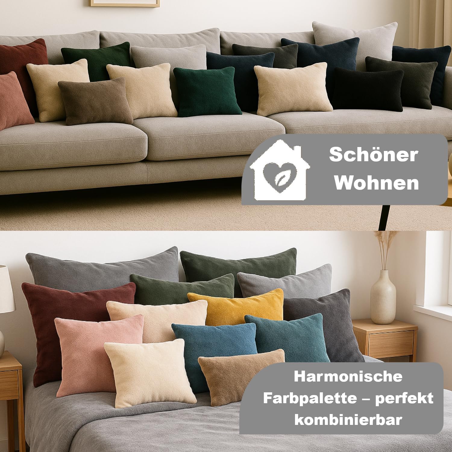 Sehr weiche, kuschelige Kissenbezüge im dezenten Taupe, die sich hochwertig anfühlen und gut verarbeitet sind. Die 40×80 cm Größe passt perfekt auf meine Sofakissen, die Farbe bleibt auch nach mehreren Wäschen schön und das Material ist angenehm warm, aber nicht kratzig. Tolles Preis-Leistungs-Verhältnis, ich bin sehr zufrieden.