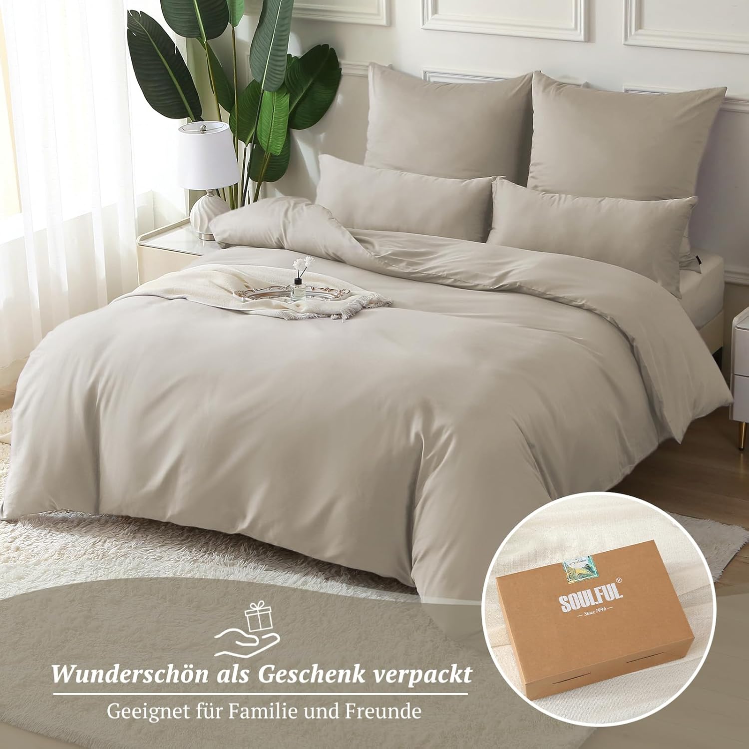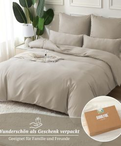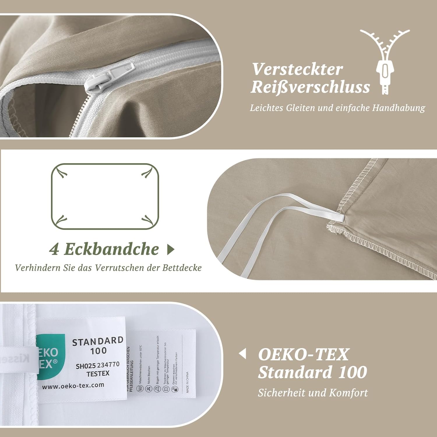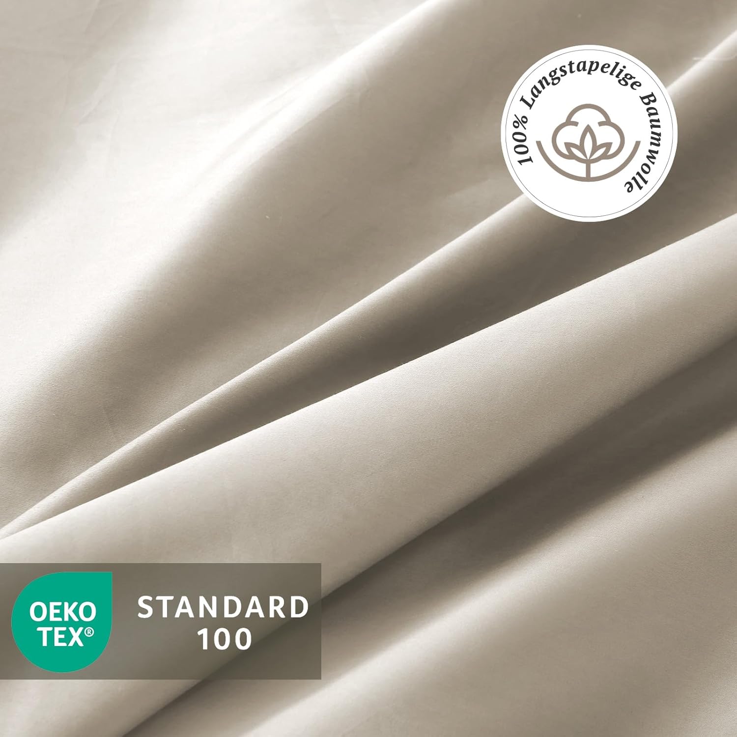Die MILDLY Satin Bettwäsche in Oatmeal fühlt sich seidig weich und angenehm auf der Haut an, die Verarbeitung wirkt hochwertig und die Größe 200×200 mit zwei 80×80-Kissenbezügen passt gut. Die 100% langstapelige Baumwolle und die Öko-Tex-Zertifizierung sowie die Eignung für Allergiker machen sie zu einer verlässlichen Wahl, und die Bezüge lassen sich unkompliziert waschen und behalten Farbe und Form.