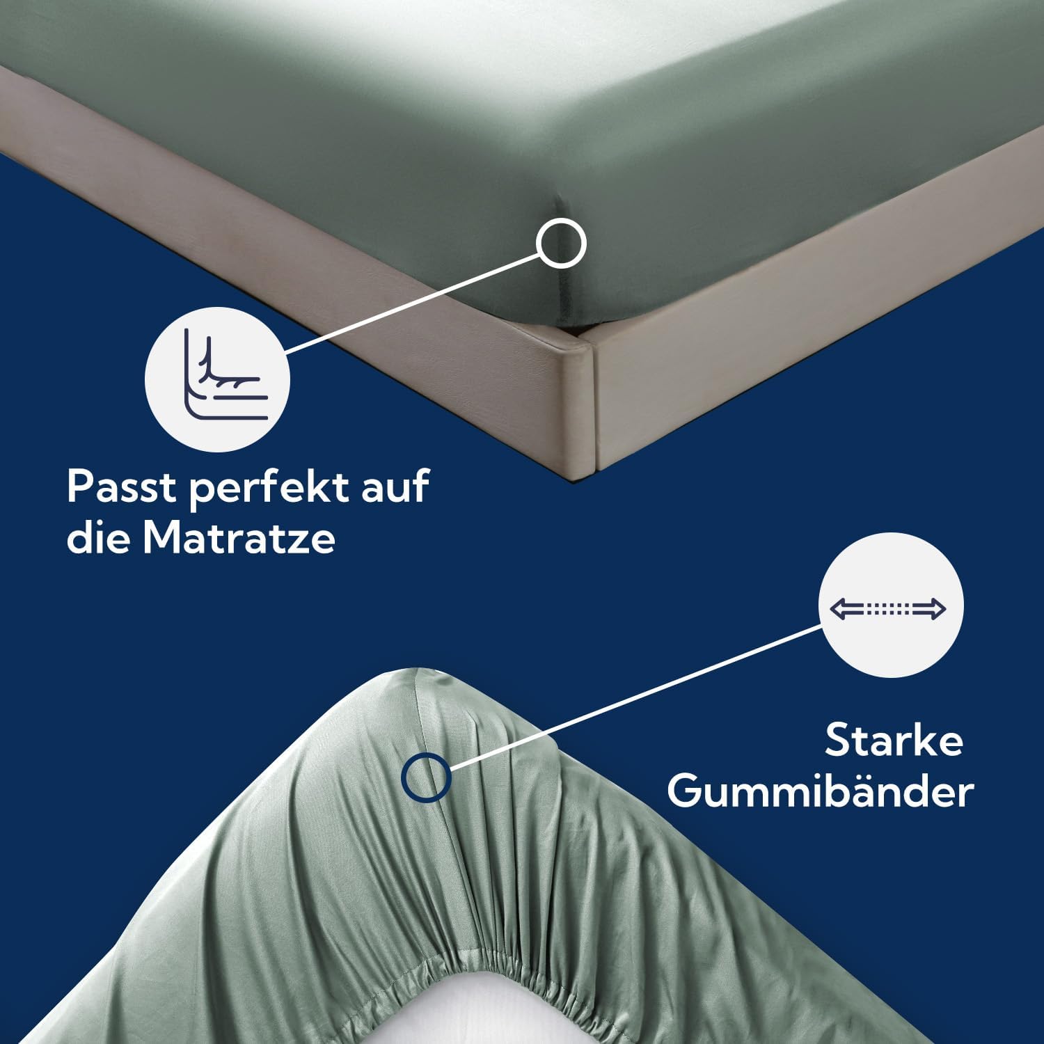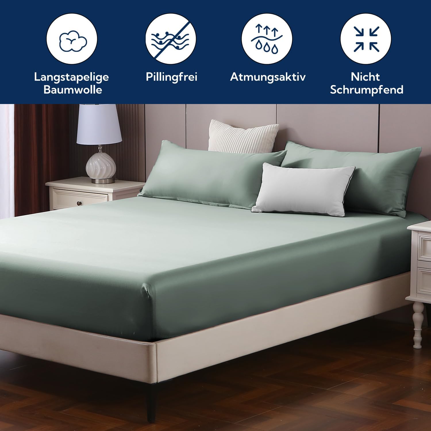 Angenehm weiches Satin-Spannbettlaken aus hochwertiger langstapliger Baumwolle, das gut auf Matratzen bis 25 cm sitzt und in der Farbe GrauSage der Beschreibung entspricht. Verarbeitung und Passform wirken solide, das Material fühlt sich auf der Haut angenehm an und lässt sich leicht beziehen.