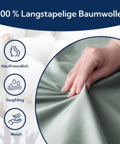 Das Spannbettlaken 140×200 aus langstapeliger Baumwolle fühlt sich seidig und angenehm an, sitzt dank Gummizug sicher auf Matratzen bis 25 cm Höhe und bleibt faltenarm. Die Farbe GrauSage wirkt unaufdringlich und hochwertig, die Oeko-Tex-Zertifizierung gibt ein gutes Gefühl und die Pflege ist unkompliziert.