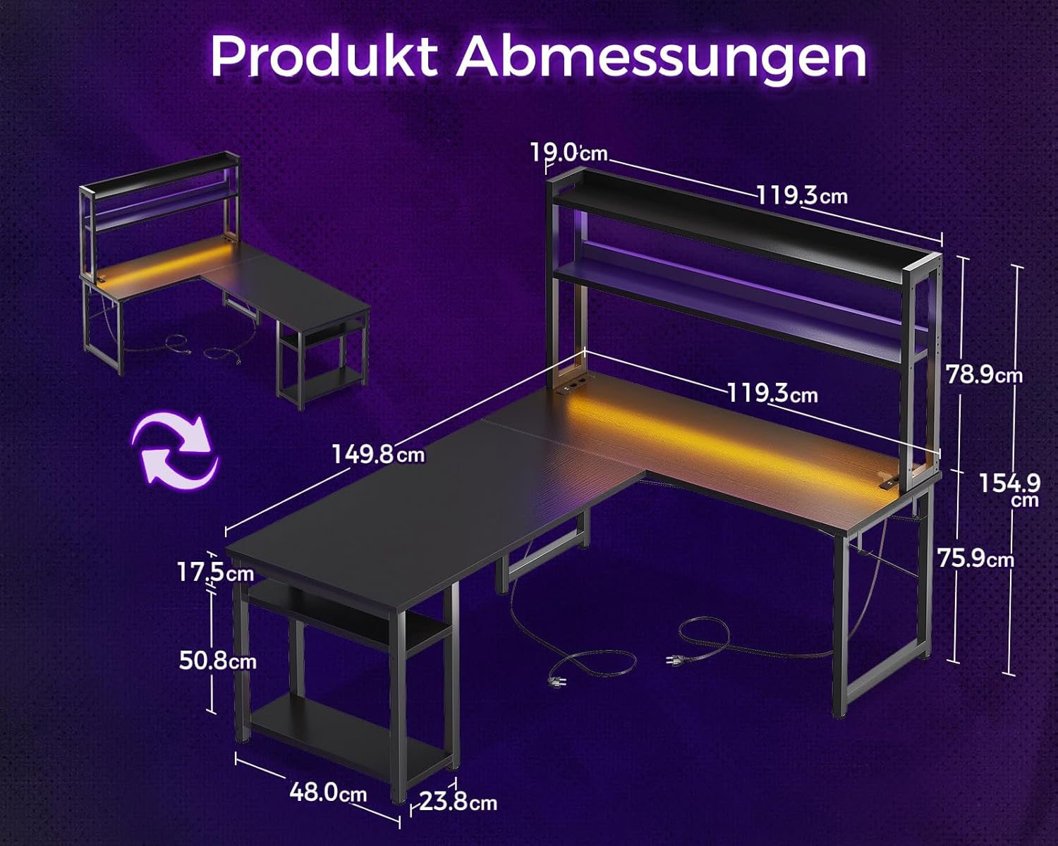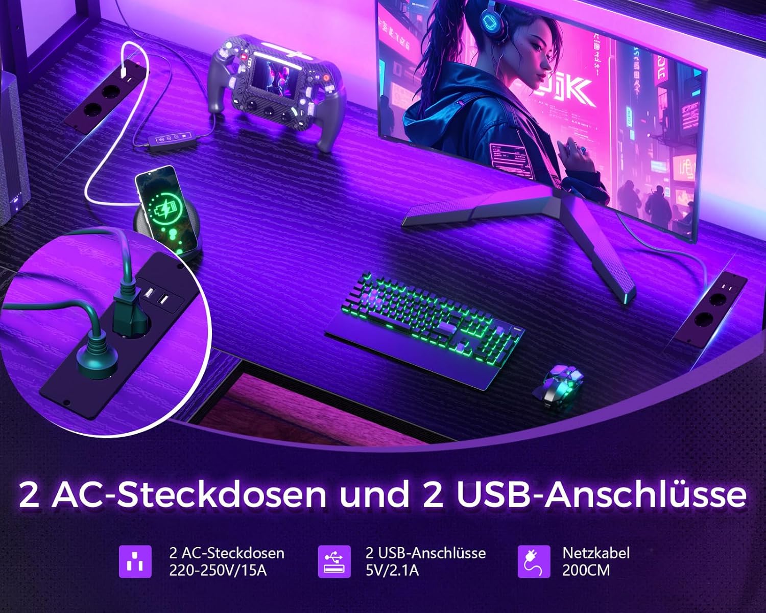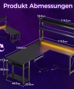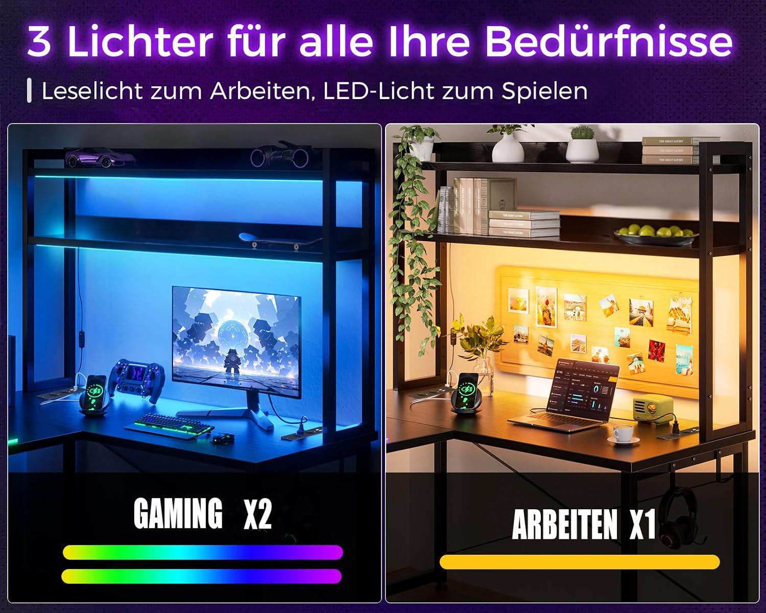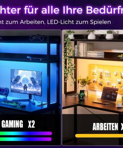 - 【L-förmiger Gaming-Schreibtisch】Dieser L-förmige Gaming-Schreibtisch wird mit 1 UPC-Ständer, 2 Ablagefächern, 2 Eisenhaken, 2 Steckdosen und 2 Arten von Lichtleisten geliefert. Ein idealer Schreibtisch für kleine Räume, der einen großartigen Raum für Heimbüro oder Spiele schafft.