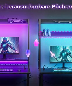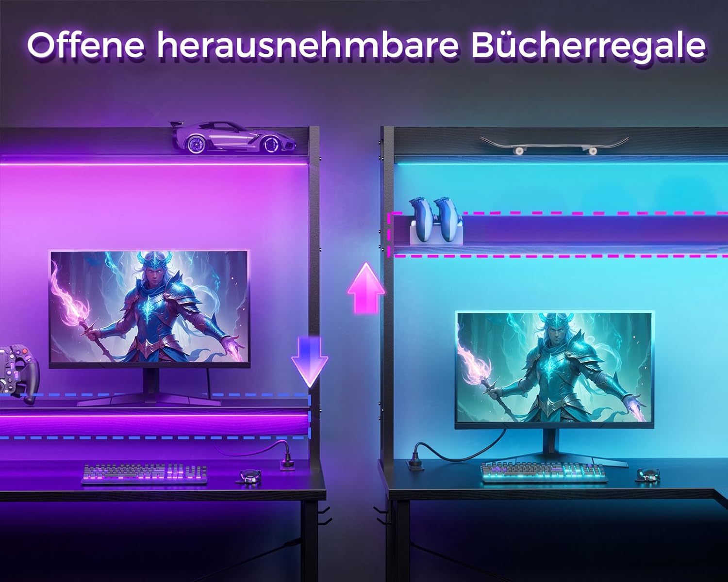 - 【Wechseln Sie zwischen Büro- und Gaming-Stil】Der Computertisch ist mit insgesamt 3 Leisten in 2 Ausführungen, 1 Leseleuchte und 2 LED-Leuchten ausgestattet. Schalten Sie das warme gelbe Leselicht ein, um Ihre Augen beim Arbeiten oder Lernen zu schützen; Schalten Sie beim Spielen oder in der Freizeit die farbwechselnden LED-Lichter ein, um Ihrem Raum E-Sport-Atmosphäre zu verleihen.