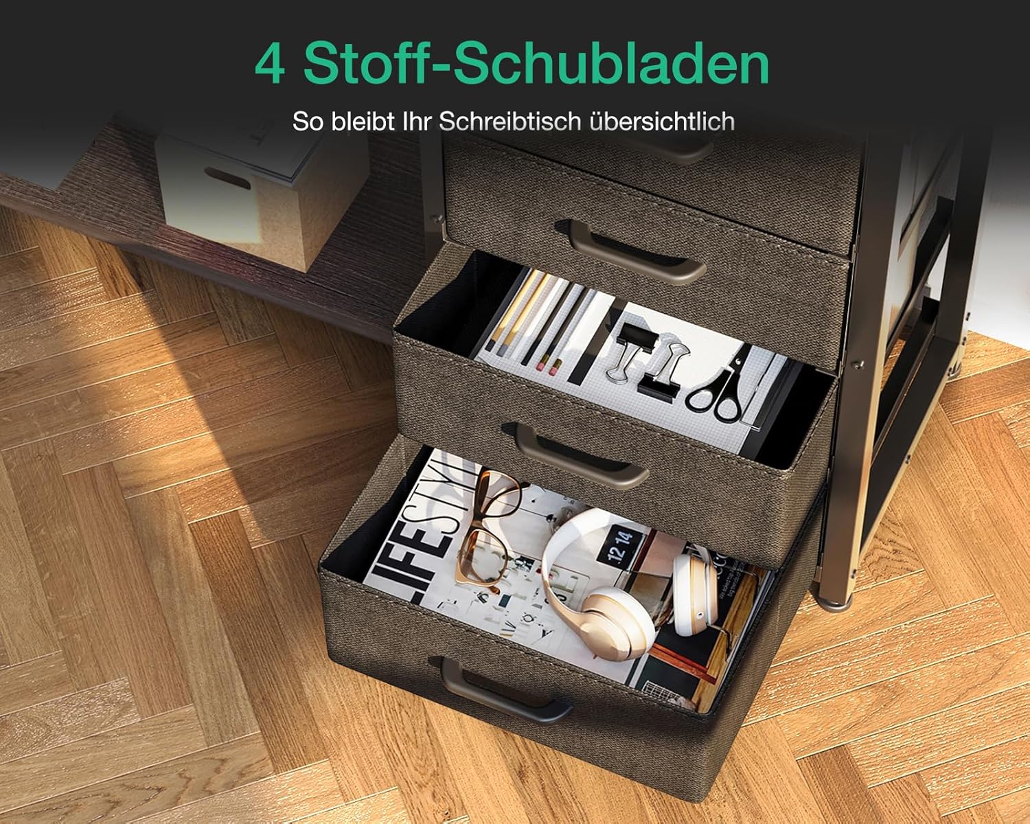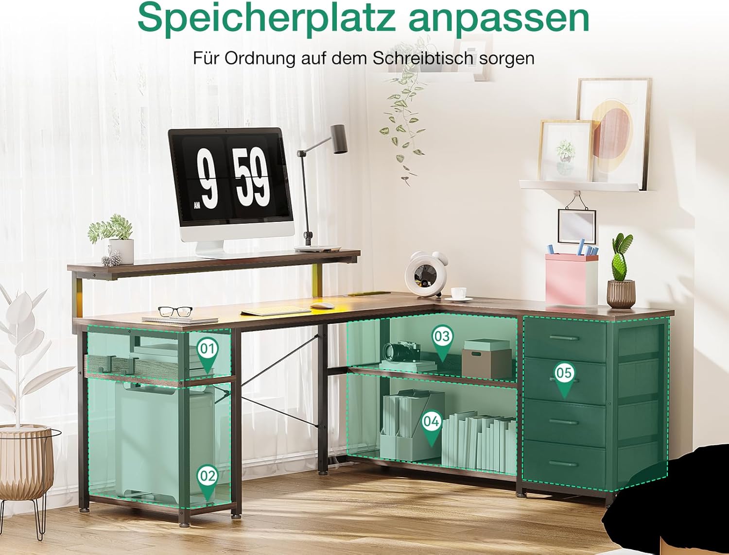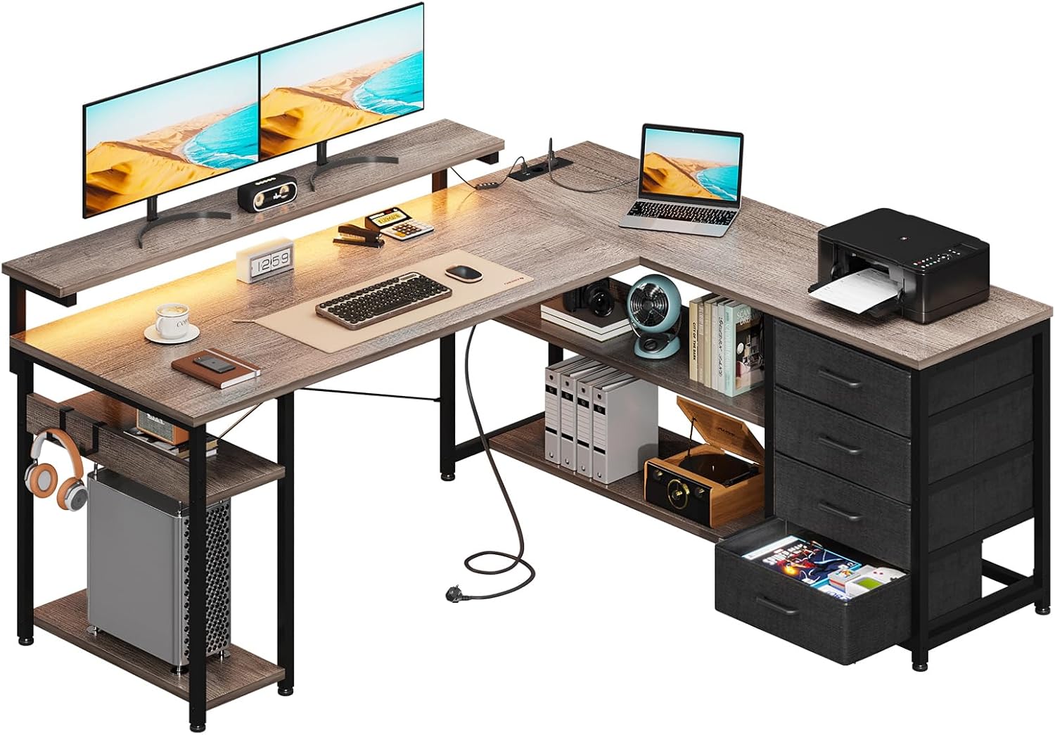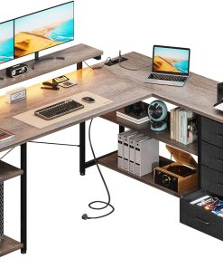 Der Schreibtisch ist sehr solide verarbeitet und bietet viel Platz dank der L-Form und den geräumigen Schubladen. Die integrierten Steckdosen und USB-Ports sind super praktisch, das LED-Licht sorgt für angenehme Stimmung und die graue Eiche sieht hochwertig aus; der Aufbau ging zügig und jetzt habe ich ein funktionales Home-Office, das ich gerne nutze.