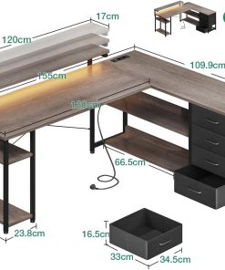 Praktischer, gut verarbeiteter Eckschreibtisch in Graue Eiche; die Aufbauanleitung war verständlich, die reversiblen Seiten und die zwei Schubladen bieten viel Platz, die integrierten Steckdosen und USB-Anschlüsse sind im Alltag sehr praktisch und das LED-Licht sorgt für angenehme Beleuchtung; insgesamt stabil und optisch ansprechend für das Home Office. Bewertung: 5
