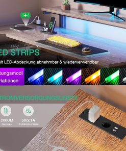 Der Eckschreibtisch bietet viel Platz und wirkt stabil verarbeitet; die reversierbare Form und die integrierten Steckdosen sowie USB-Anschlüsse sind praktisch fürs Homeoffice, die LED-Beleuchtung sorgt für angenehmes Licht und das graue Eichen-Finish fügt sich dezent in verschiedene Räume ein.