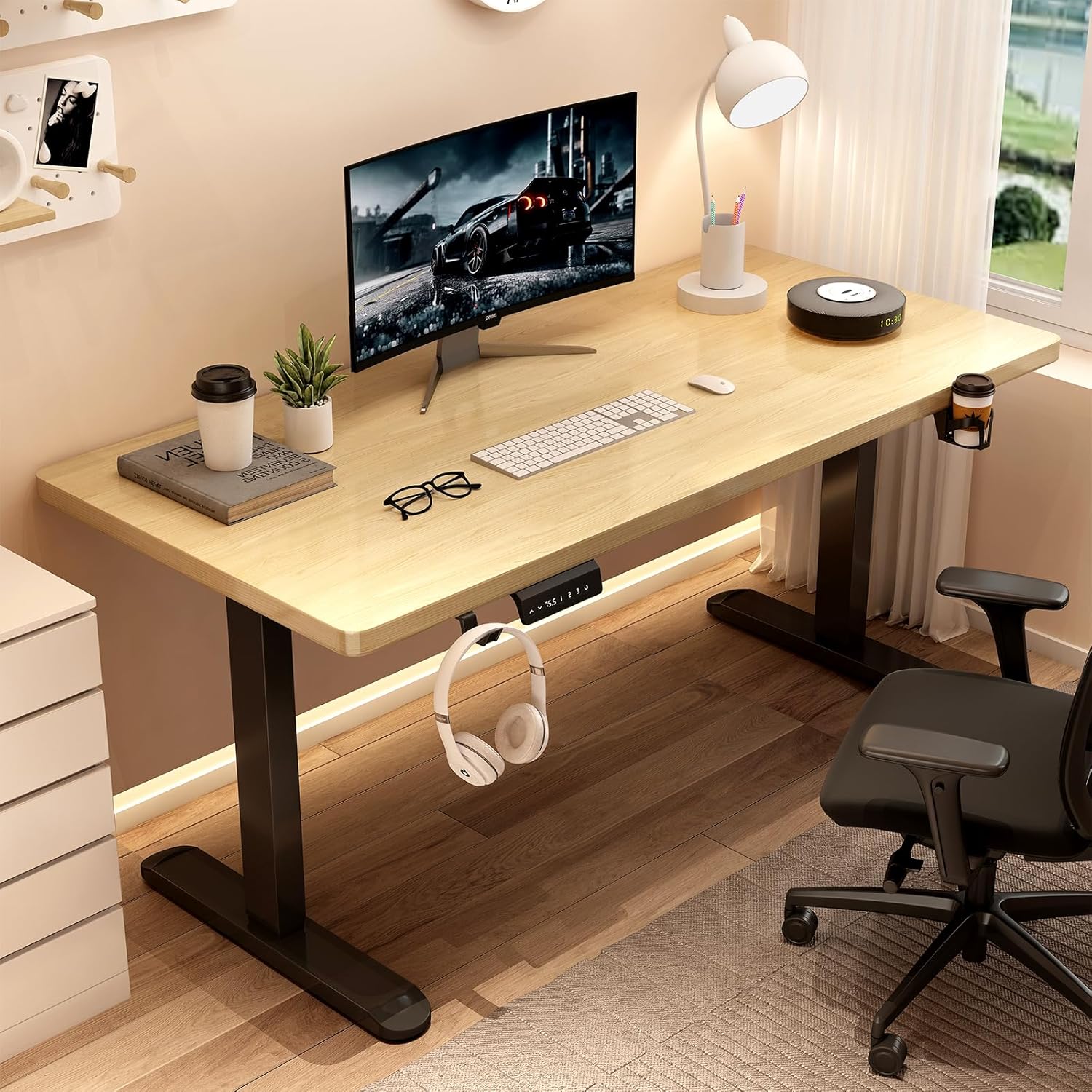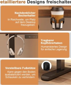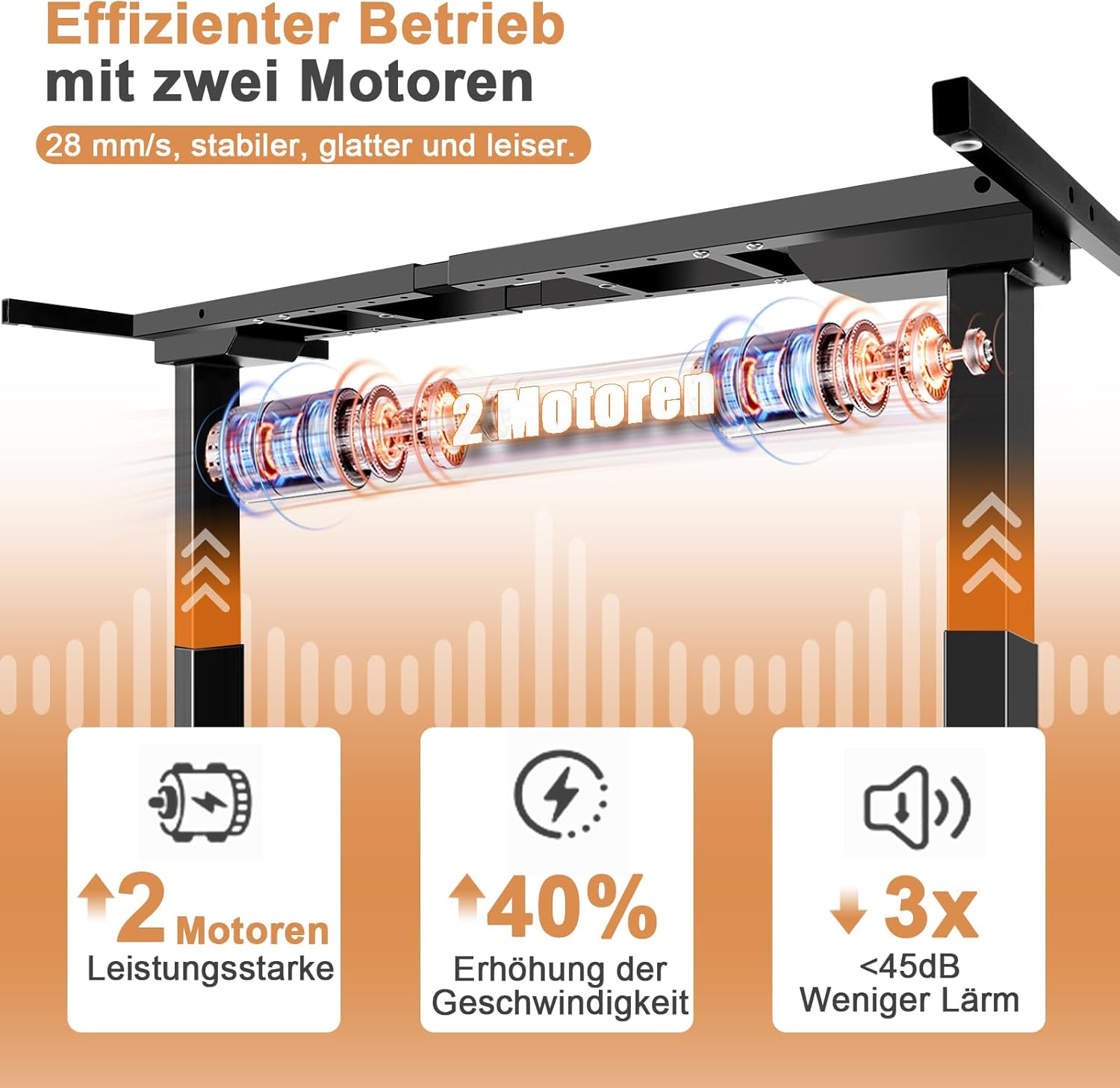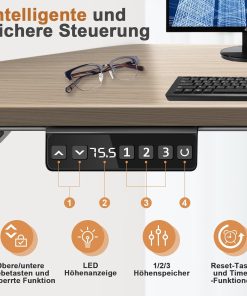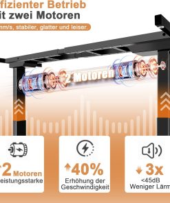 - Dual silent motors: the height-adjustable electric desk works with a noise level of less than 45 dB, so you can work in a quiet, distraction-free environment. It offers more power and load capacity, smoother height adjustment and a lifting speed of 32 mm/sec.