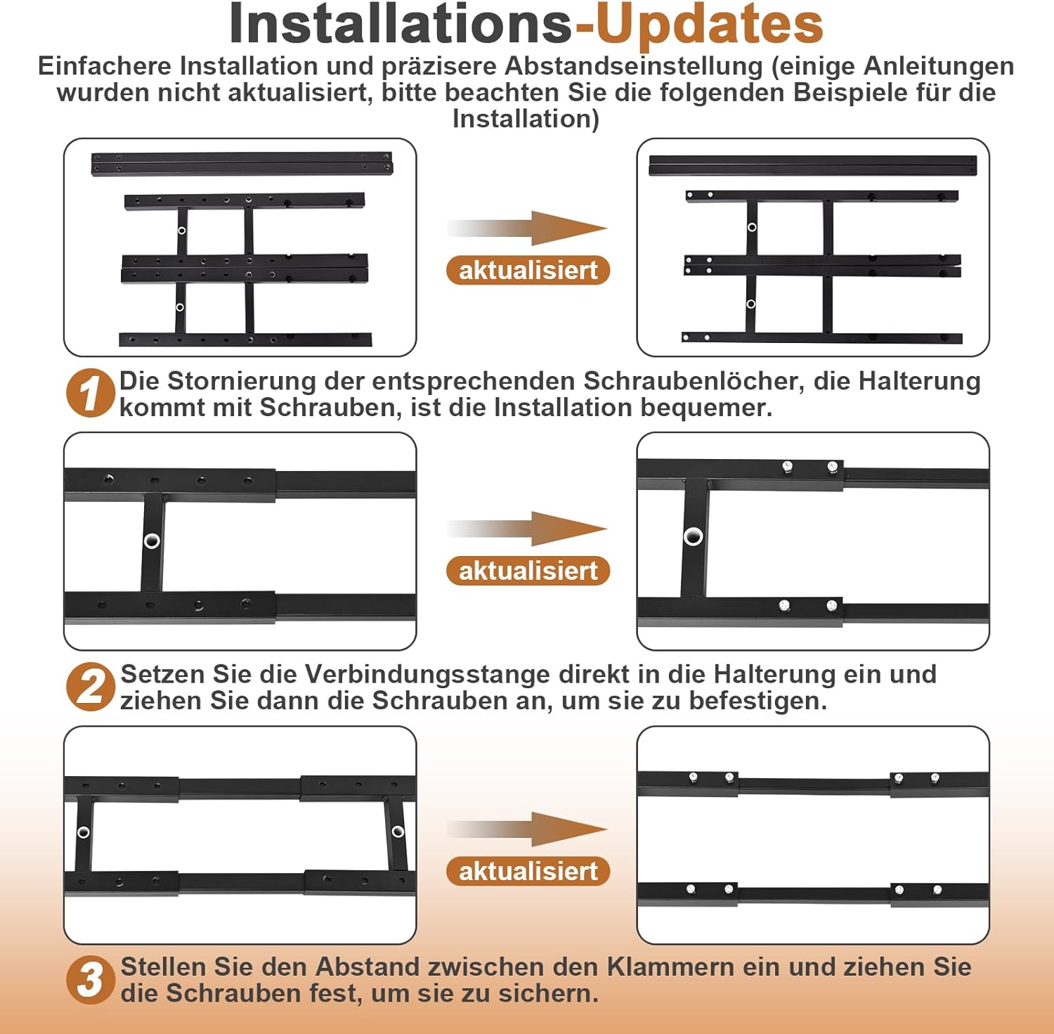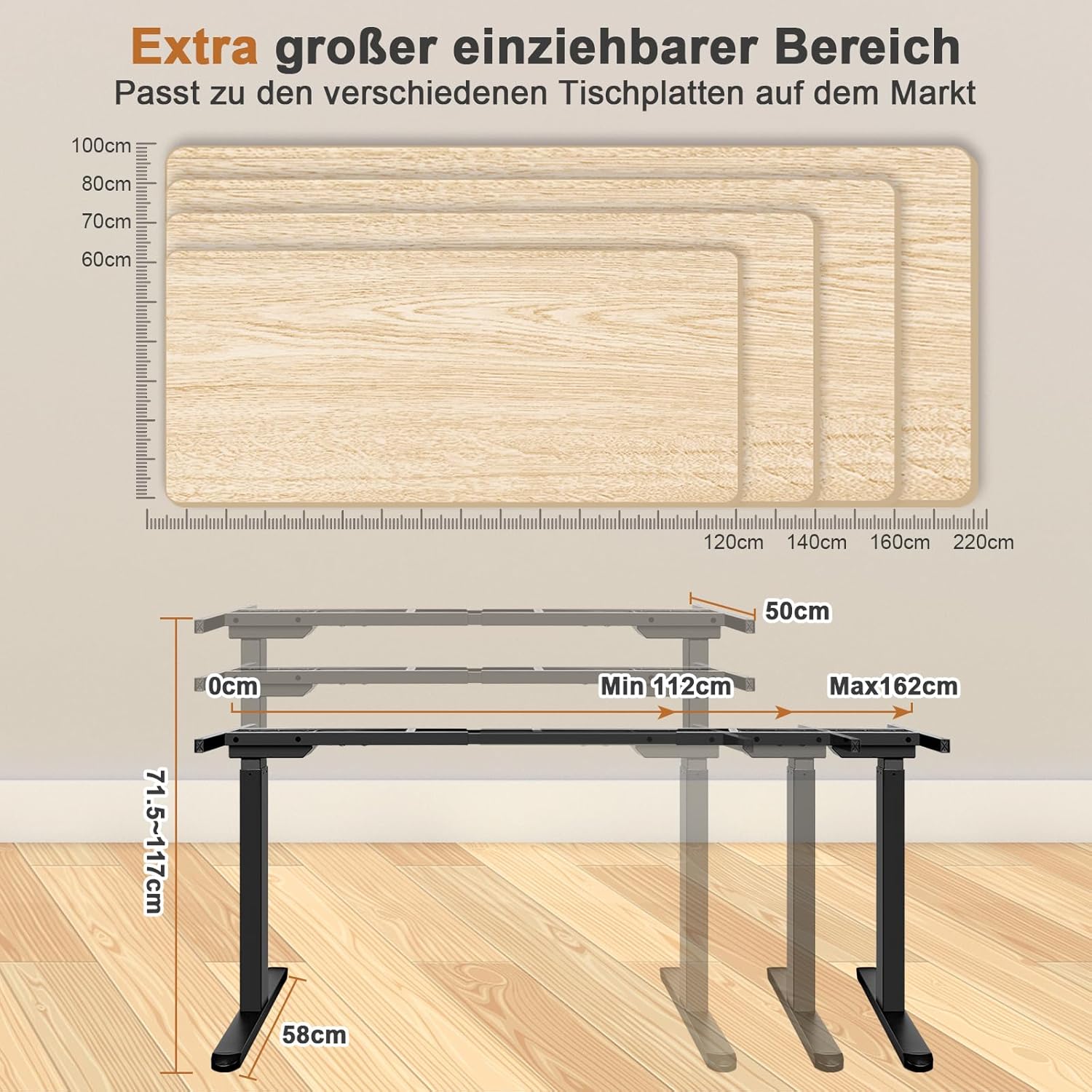 - Choose your desktop: the frame length is adjustable and suitable for different table sizes. The length of the frame can be extended from 112 cm to 162 cm and the width is set to 50 cm, suitable for table tops with a length of 120-220 cm and a width of 60-100 cm.