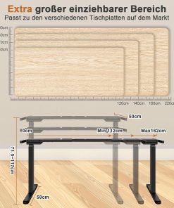 - Height-adjustable desk: (without table top). This height-adjustable electric desk extends your work area with adjustable heights from 71.5 cm to 117 cm for ergonomic comfort and height flexibility. Enjoy seamless transitions between sitting and standing working position for greater comfort and productivity.