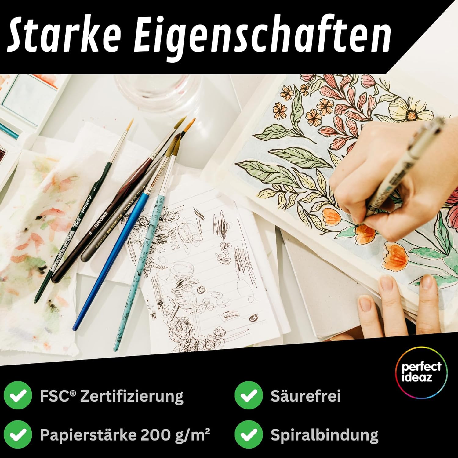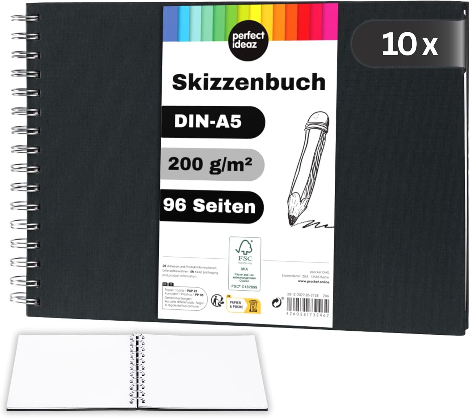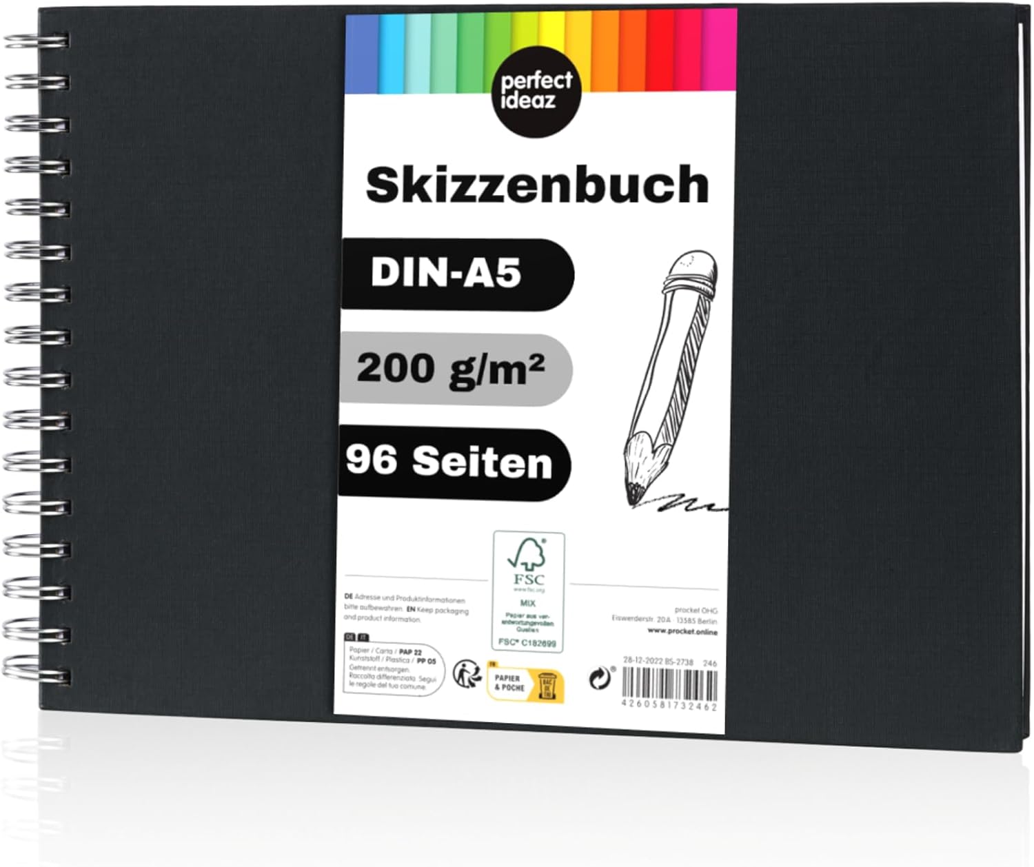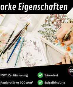 Sehr zufrieden mit dem Skizzenbuch: die Spiralbindung liegt flach, das Hardcover schützt gut und das 200 g/m² Papier ist schön dick, so dass Bleistift und Marker kaum durchdrücken. Die 96 Seiten bieten viel Platz und die FSC-Zertifizierung ist ein tolles Extra. Klare Kaufempfehlung.