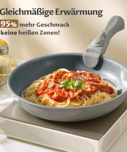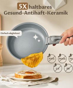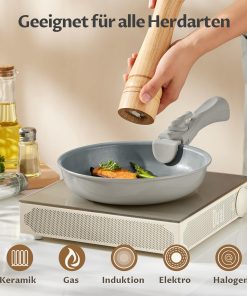 Das Pfannenset (20/24/28 cm) überzeugt mit guter Antihaft-Keramikbeschichtung, gleichmäßiger Wärmeverteilung und einem stabilen, induktionsfähigen Boden; der abnehmbare Griff ist praktisch für platzsparende Aufbewahrung und Camping, die Pfannen funktionieren zuverlässig auf allen Herdarten. Die Reinigung ist unkompliziert und die Verarbeitung wirkt solide, insgesamt ein durchdachtes Set für den Alltag.