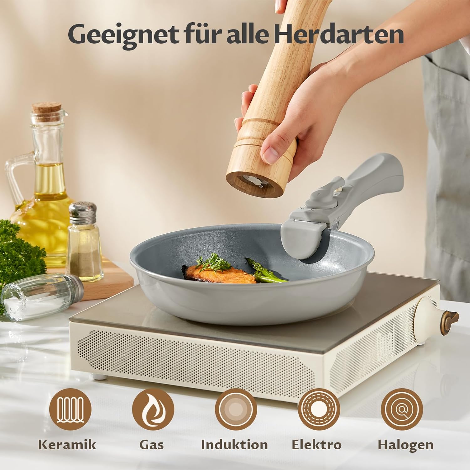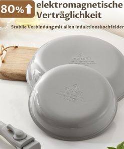 Das Pfannenset in den Größen 20, 24 und 28 cm bietet eine sehr gute Antihaft-Keramikbeschichtung und einen stabilen, molekular gebondeten Induktionsboden; der abnehmbare Griff spart Platz und macht die Pfannen vielseitig für alle Herdarten sowie fürs Camping. Reinigung und Handhabung sind unkompliziert, die Verarbeitung wirkt hochwertig und erfüllt die Erwartungen an ein praktisches Alltagsset.